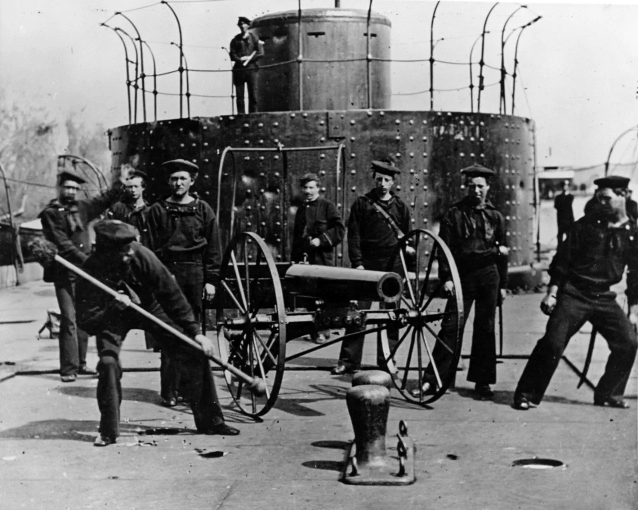 Crewmembers aboard USS Lehigh (likely on the James River in 1864-1865) exercise a 12-Pounder Dahlgren Boat Howitzer on the monitor’s deck. Dents received from hits sustained off of Charleston are visible on the turret. Naval History and Heritage Command Photo: https://www.history.navy.mil/content/history/nhhc/our-collections/photography/numerical-list-of-images/nhhc-series/nh-series/NH-59000/NH-59436.html