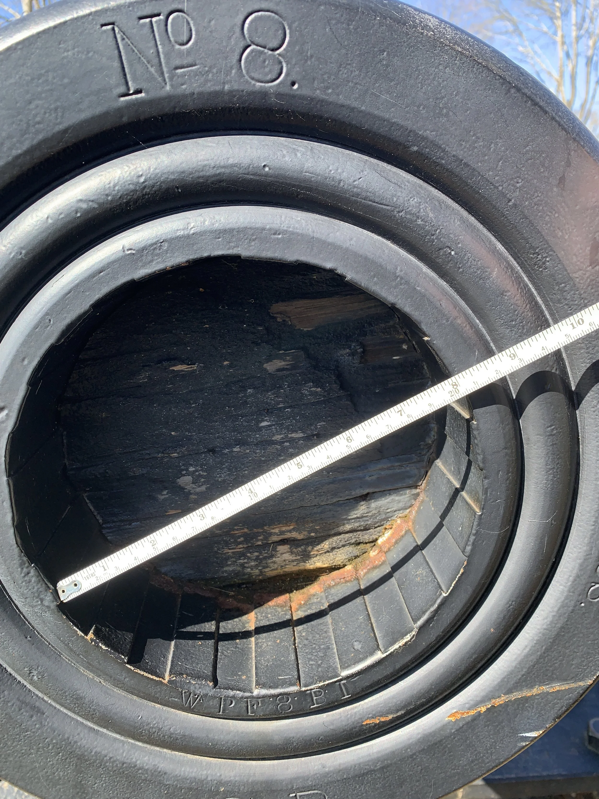 The rectangular knob used to wrench the breech insert sleeve into place is seen amid the sockets of the old cast iron tube. The knob precluded use of the old Rodman socket and post elevation system. Elements of the gearing used for elevation can be seen in the photo.