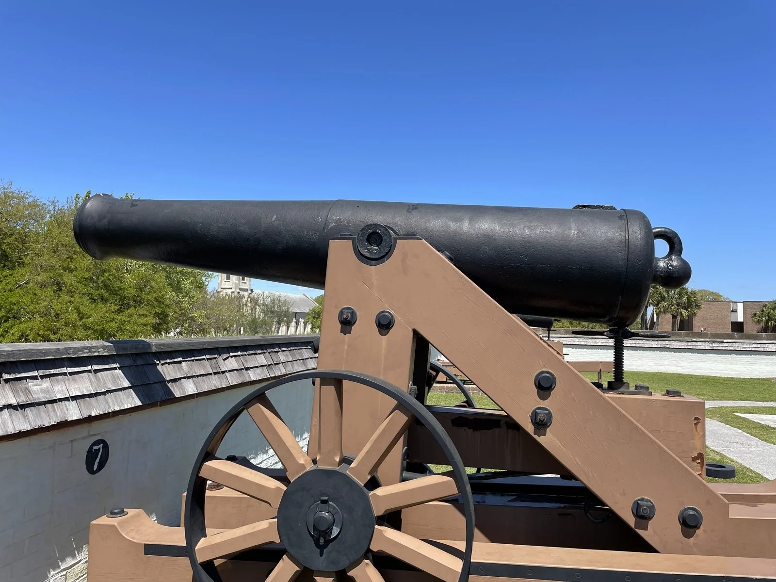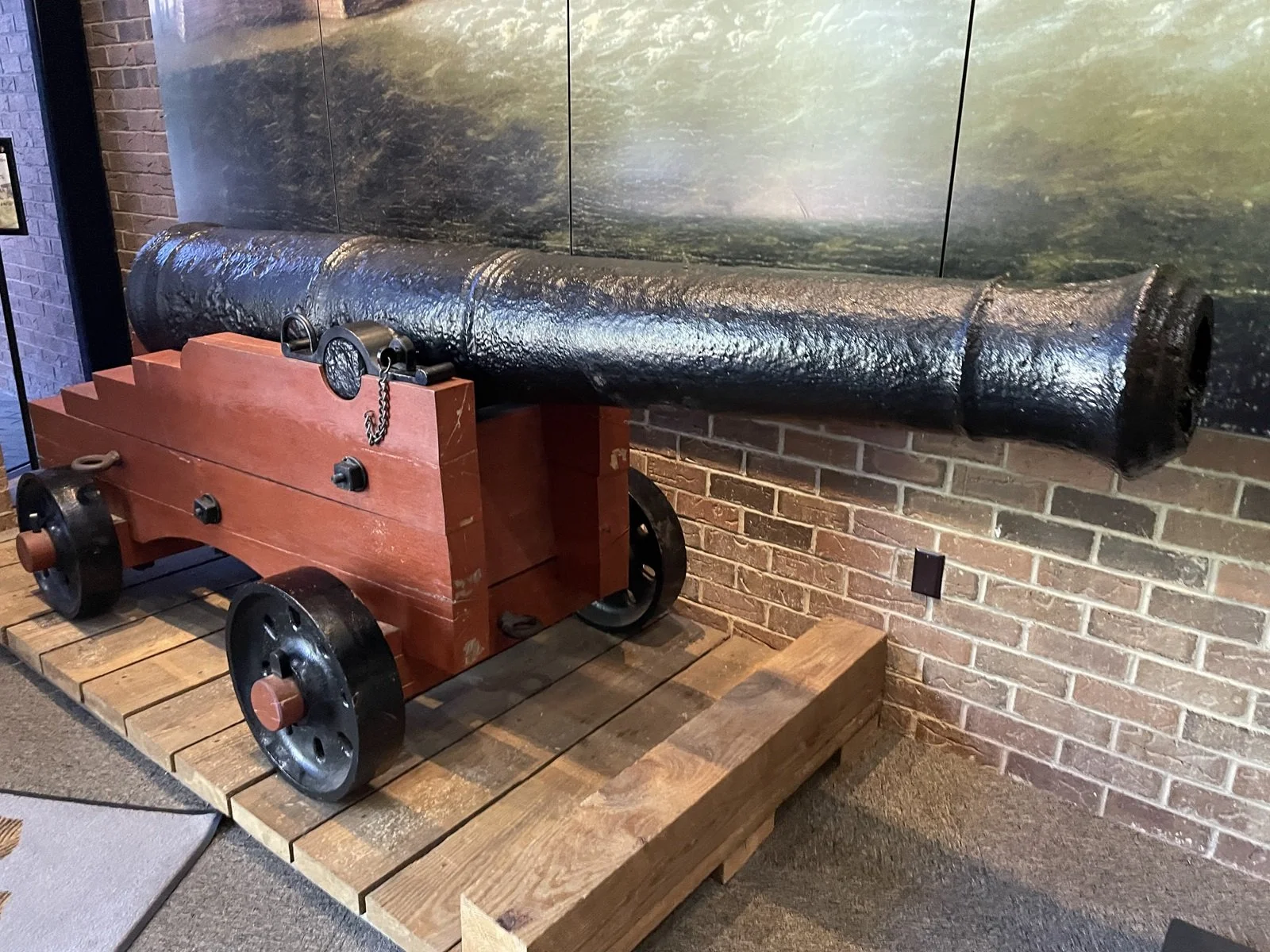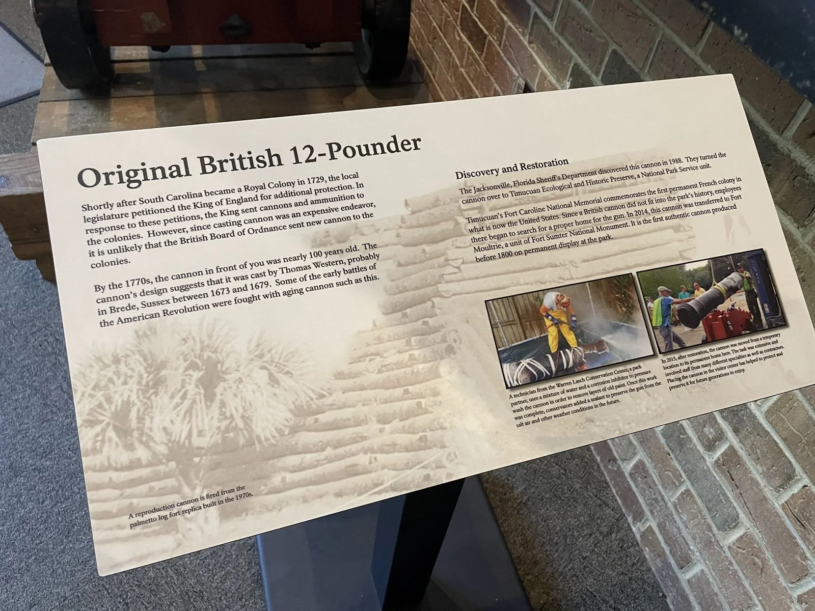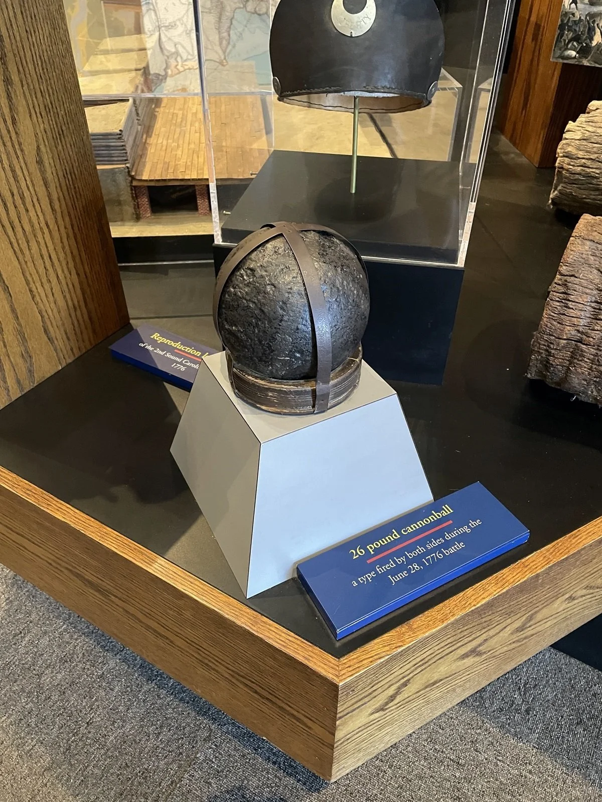 “26 Pound Cannonball” - The heaviest cannon of Fort Sullivan where 19 French 24-Pounders which had been taken off the French ship-of-the-line Foudroyant which had been captured by the British in 1758. They are referred to as 26-pounders due to the French pound being a bit heavier than the English. I find it interesting that the British Crown armed a colony with these non-standard cannons.