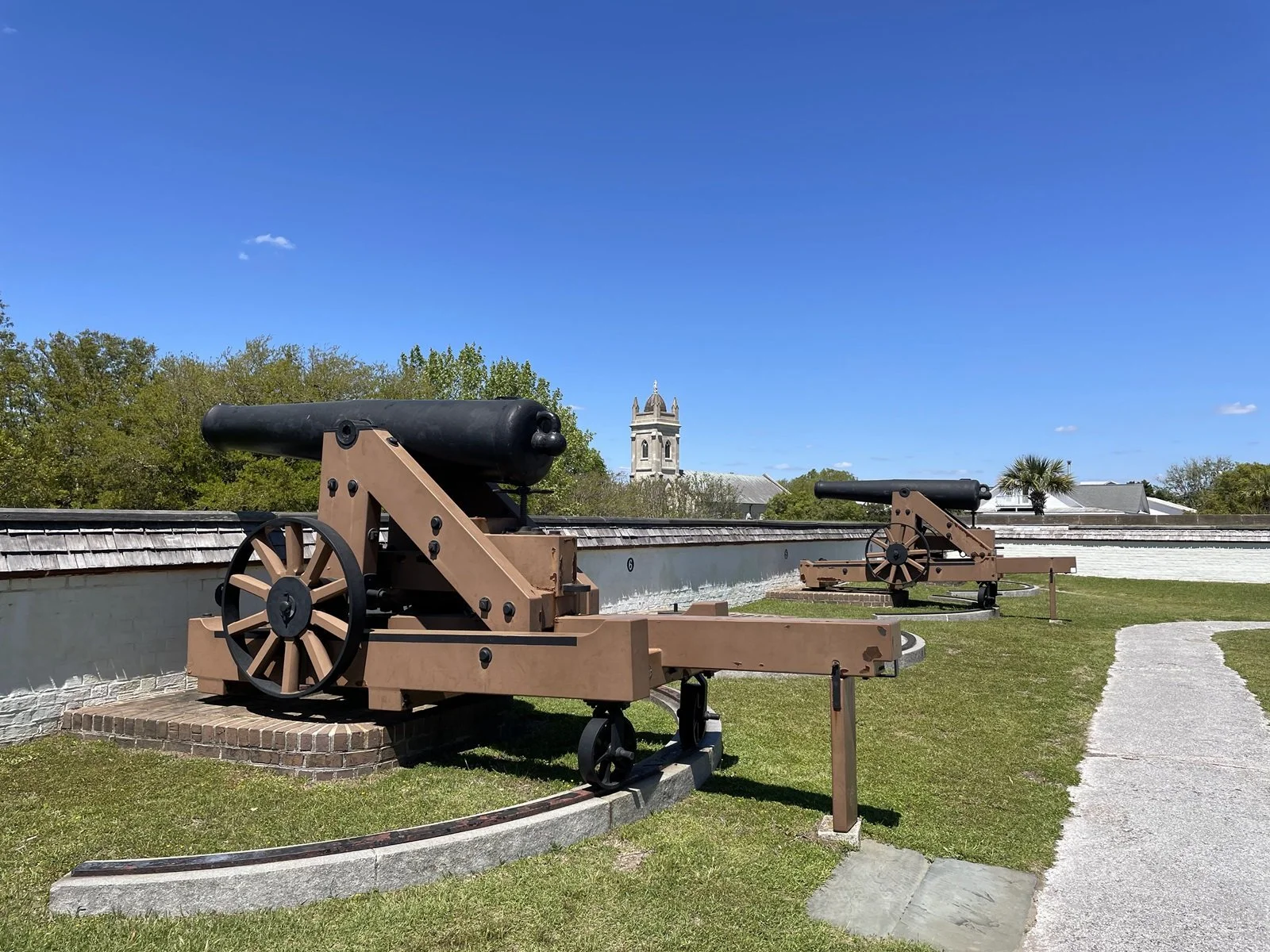 Two Model 1829 32-Pounders preserved at Fort Moultrie. The two cannon are mounted on front-pintle barbette carriages. The steeple of Stella Maris Catholic Church may be seen in the background.