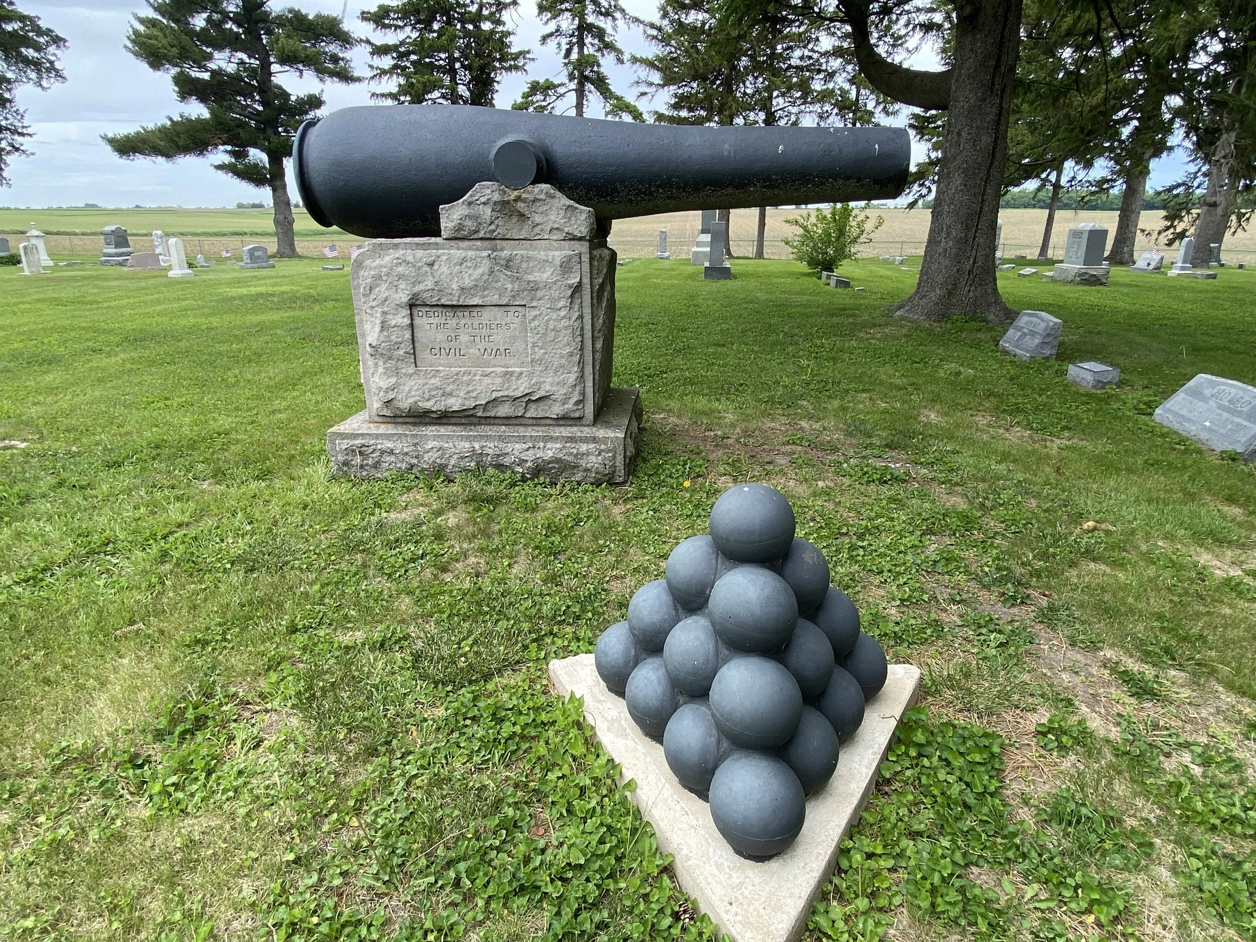 An 8-Inch Confederate Columbiad is displayed in Johnson Grove Cemetery near Waterman, Illinois. It sits atop a pedestal bearing the inscriptions “Dedicated to the Soldiers of the Civil War” and “Erected 1905.”