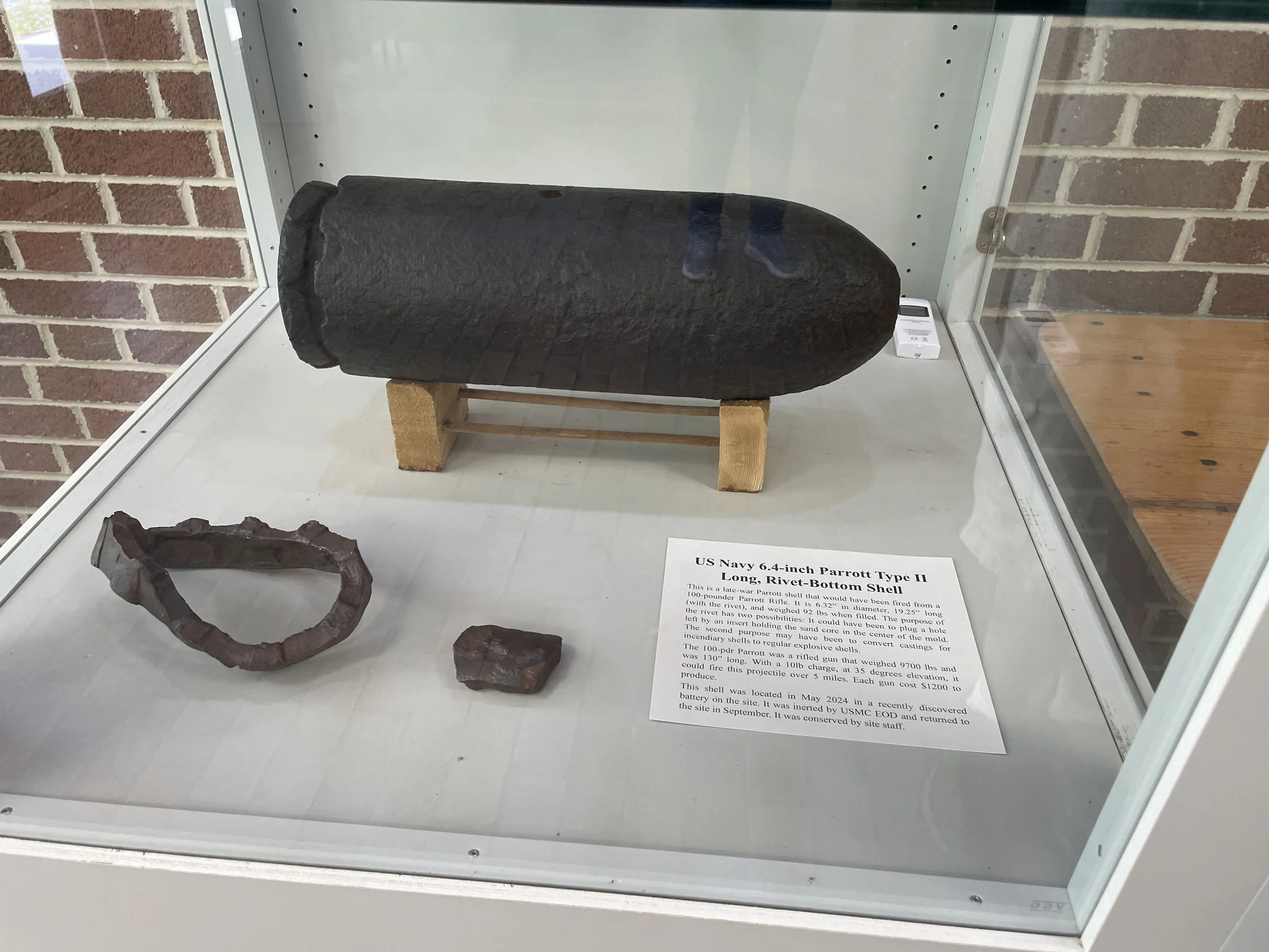 A 100-Pounder shell recovered at Fort Anderson in North Carolina. This shell weighed 92 pounds when filled. It is similar to the forty-six shells fired by USS Dawn’s 100-Pounder at the Battle of Wilson’s Wharf.