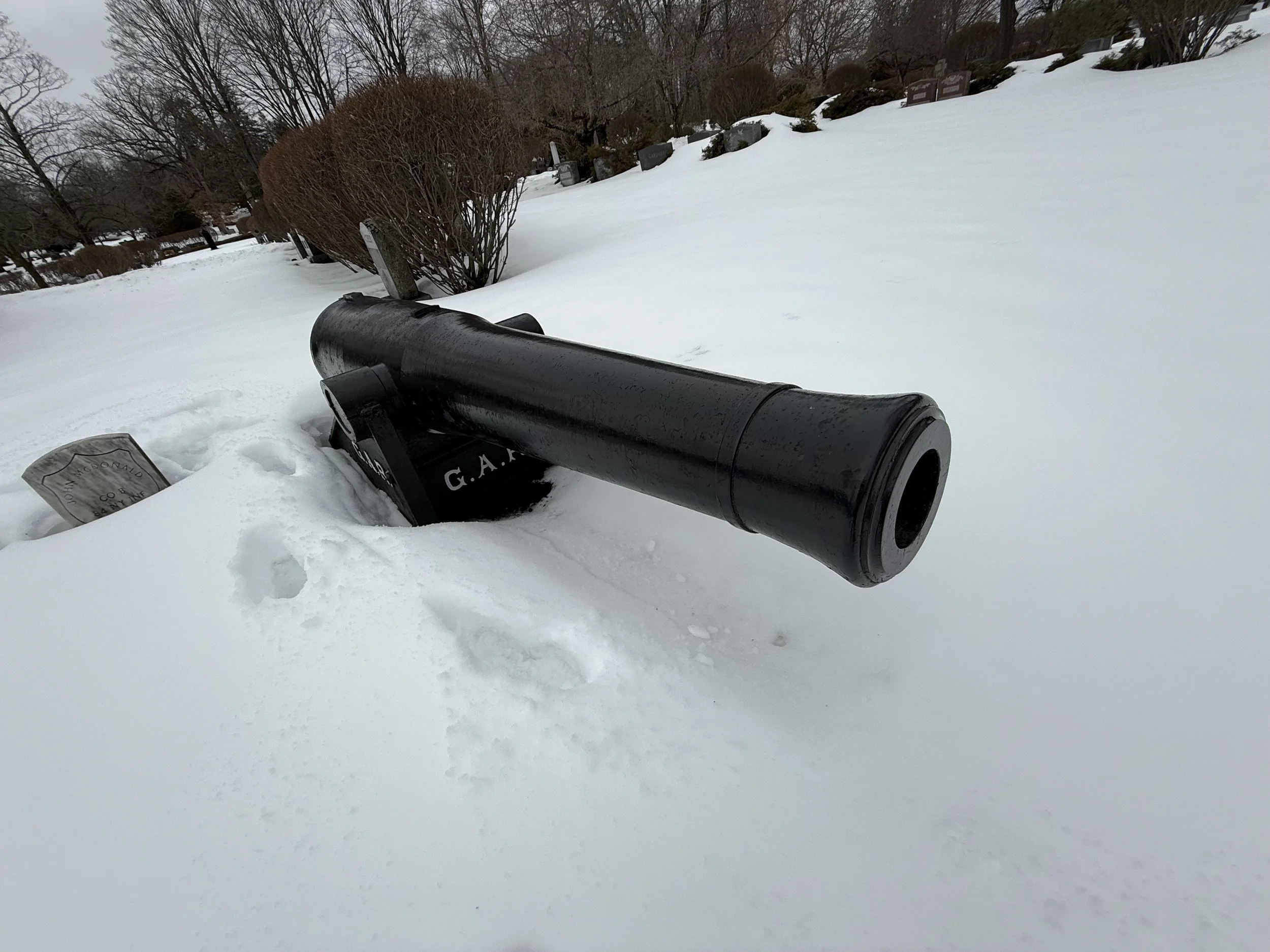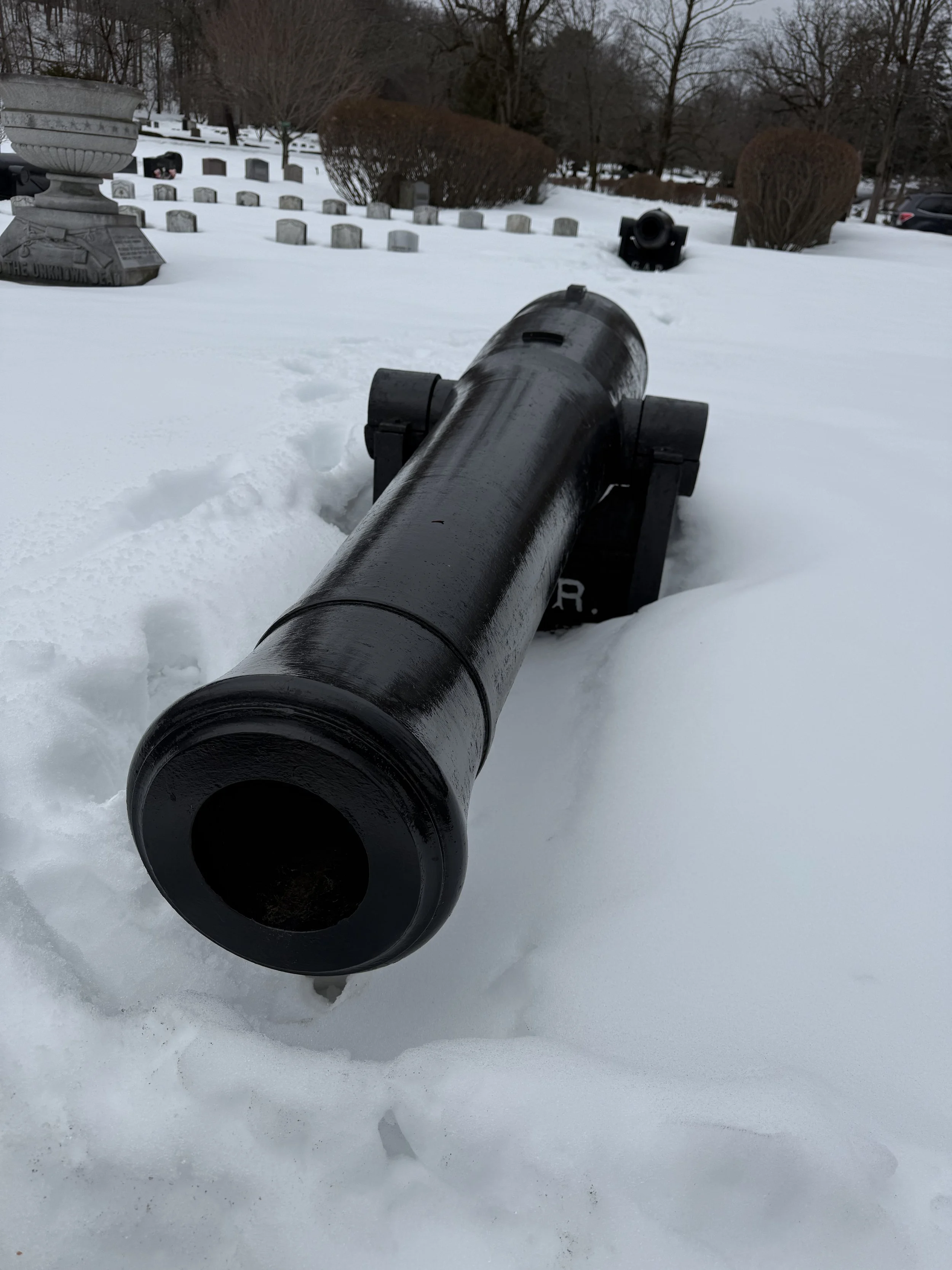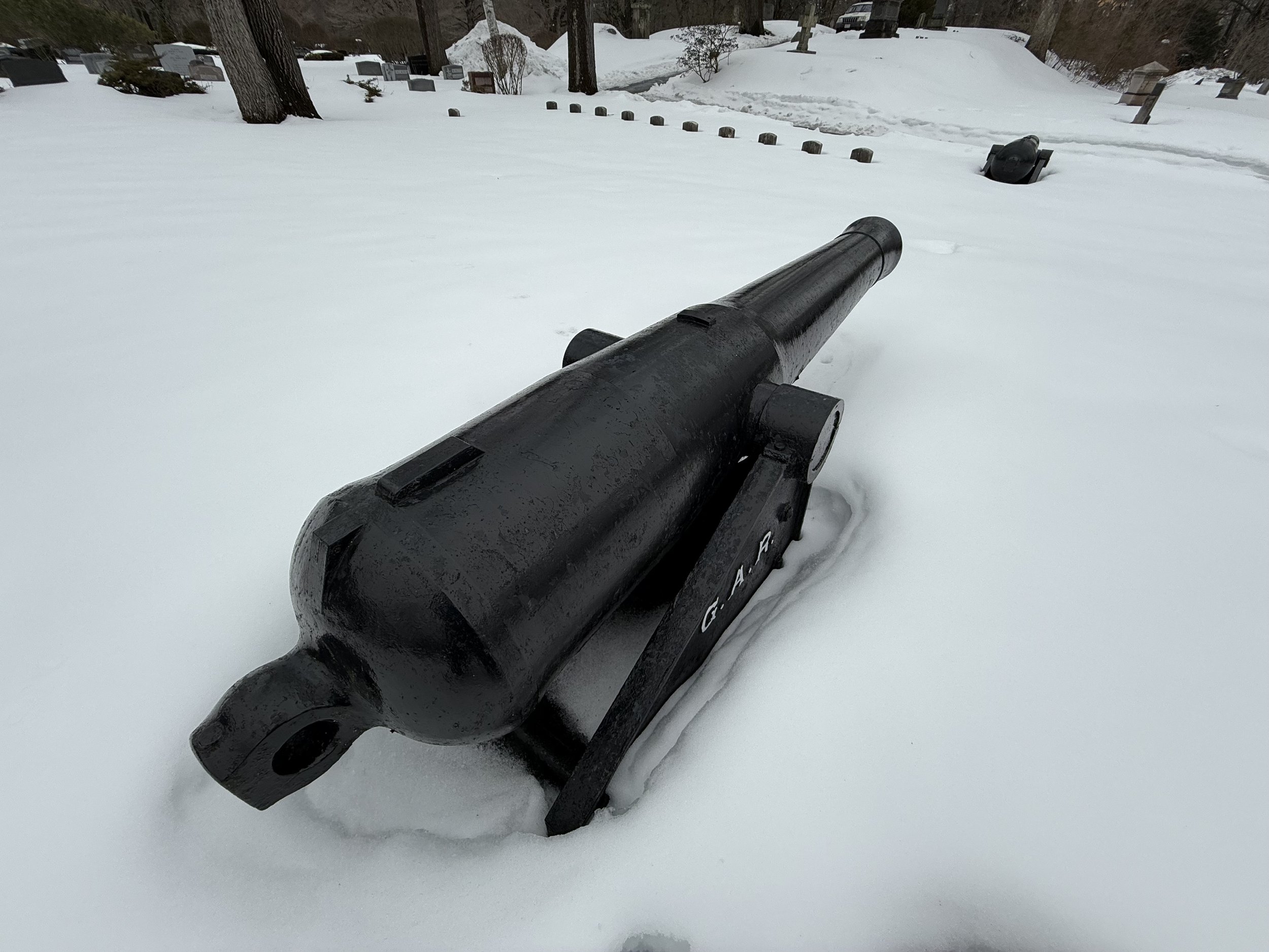 One hundred two 32-Pounders of this type cast were for the Navy in 1846-1847 (all by Tredegar Foundry in Richmond, Virginia), but only thirteen are known to exist. Nine of those which exist may be found in Massachusetts: four in Weymouth, these four in Lowell Cemetery, and another in Highland Cemetery in Norwood. Together these form a consecutive set of registry numbers from 82 to 90. (Number 81 is in Waseca, Minnesota.)