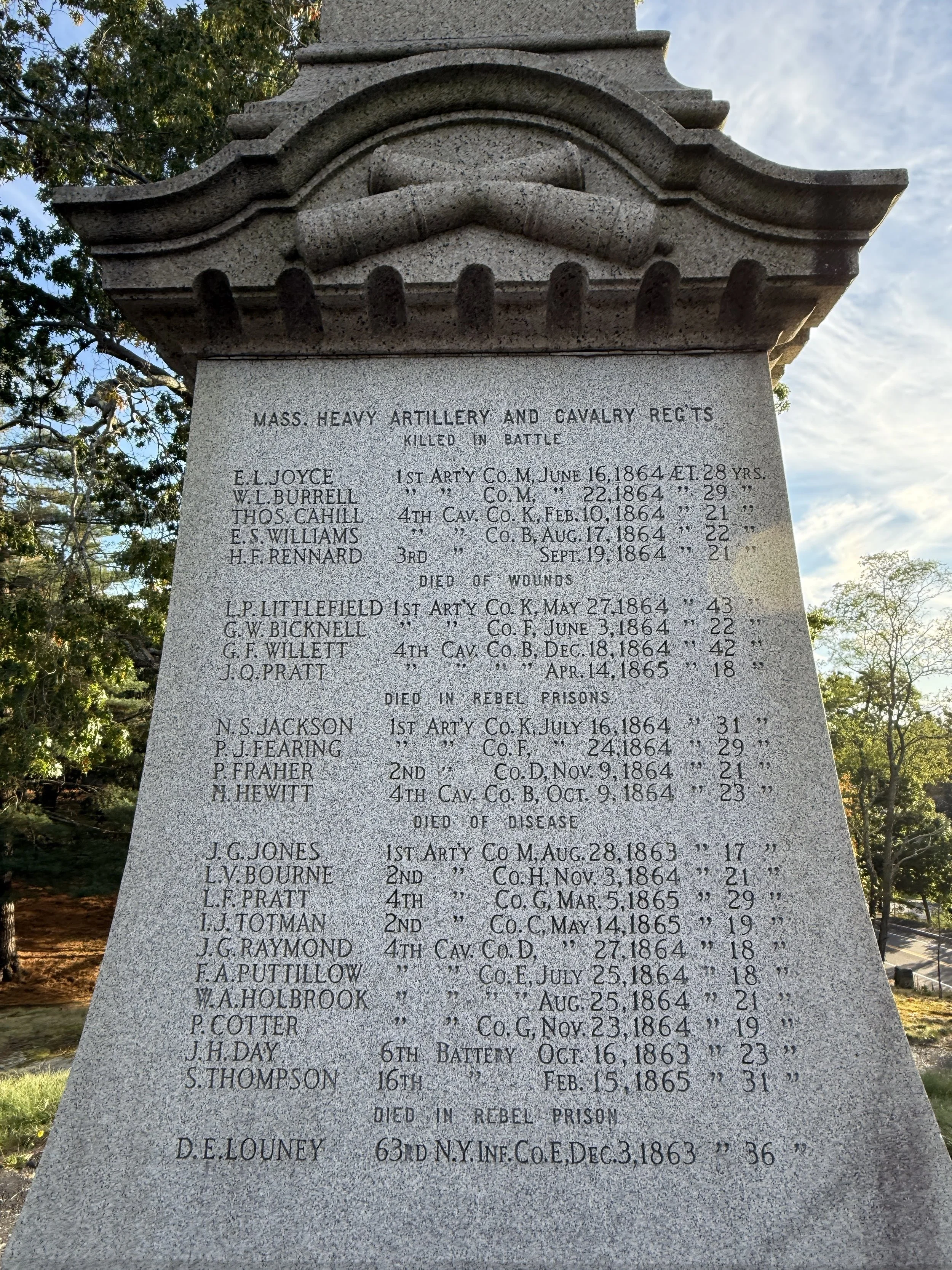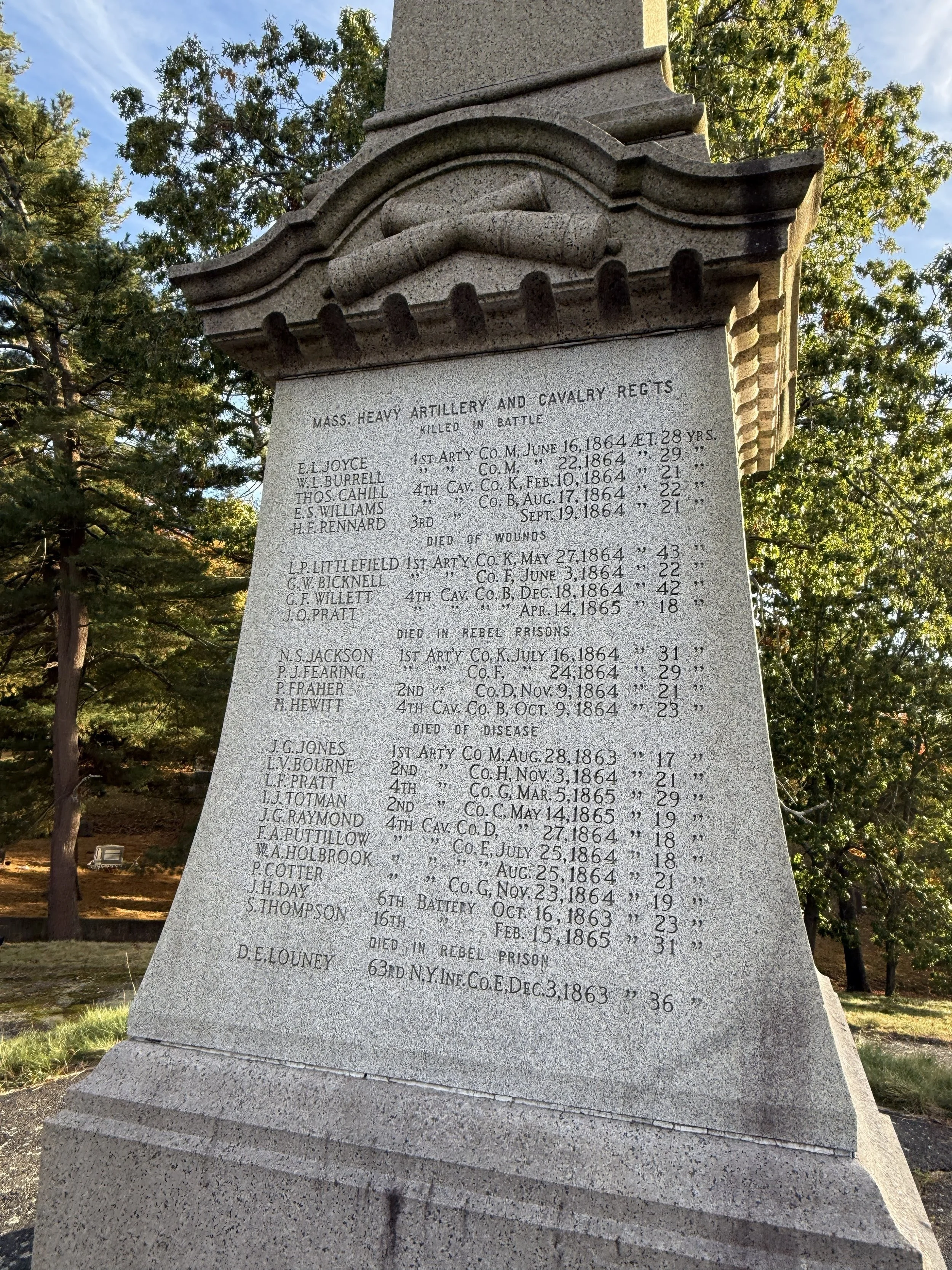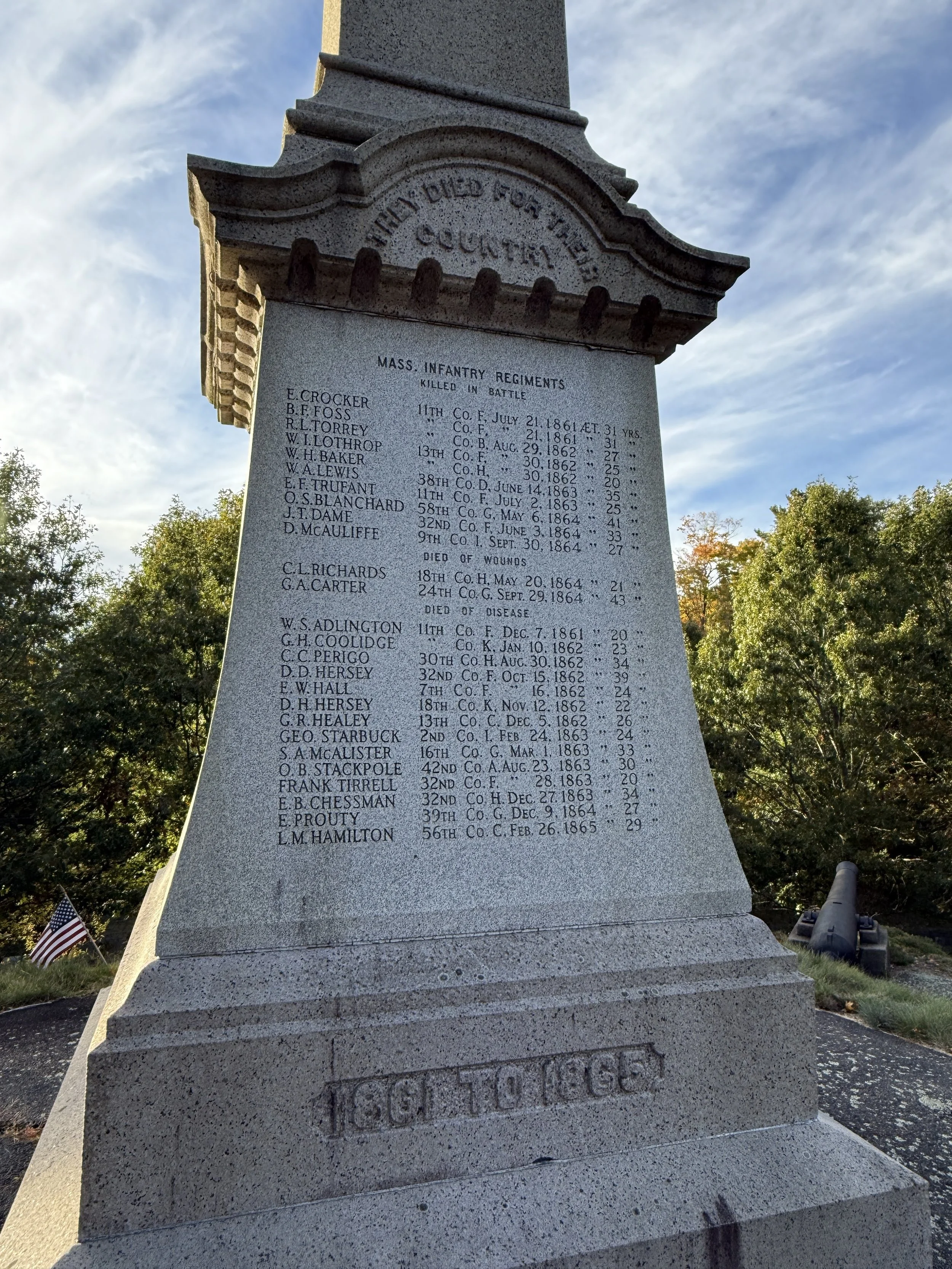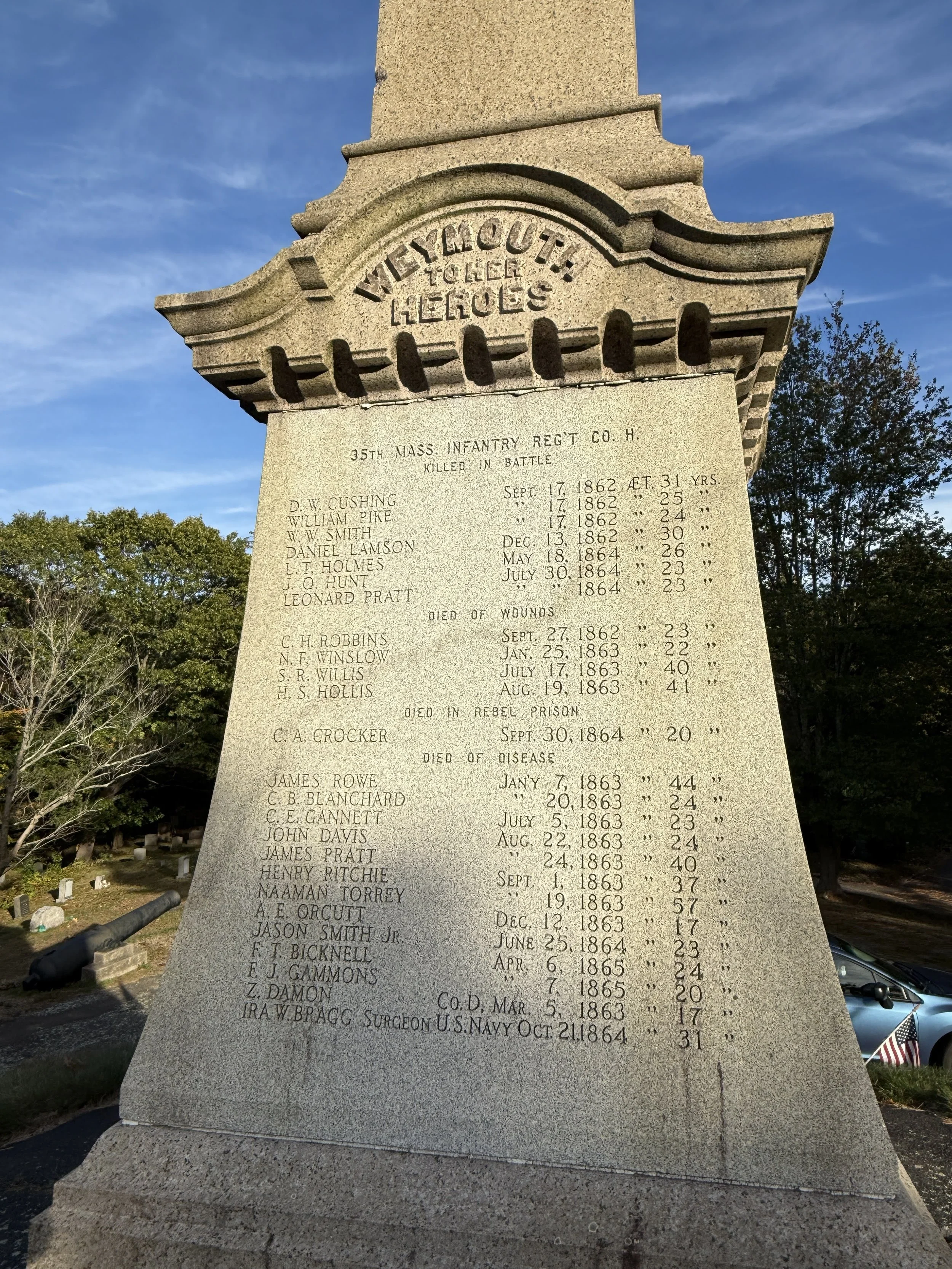Four US Navy 32-Pounders of 51 Hundredweight surround a Monument dedicated to the Soldiers and Sailors of Weymouth, Massachusetts who died during the American Civil War. The monument was dedicated in 1868 and lists each man by his unit and the circumstances of his death. The fearsome toll taken by disease during the war can clearly be seen etched in stone. The cannons were likely placed later in the 19th century.