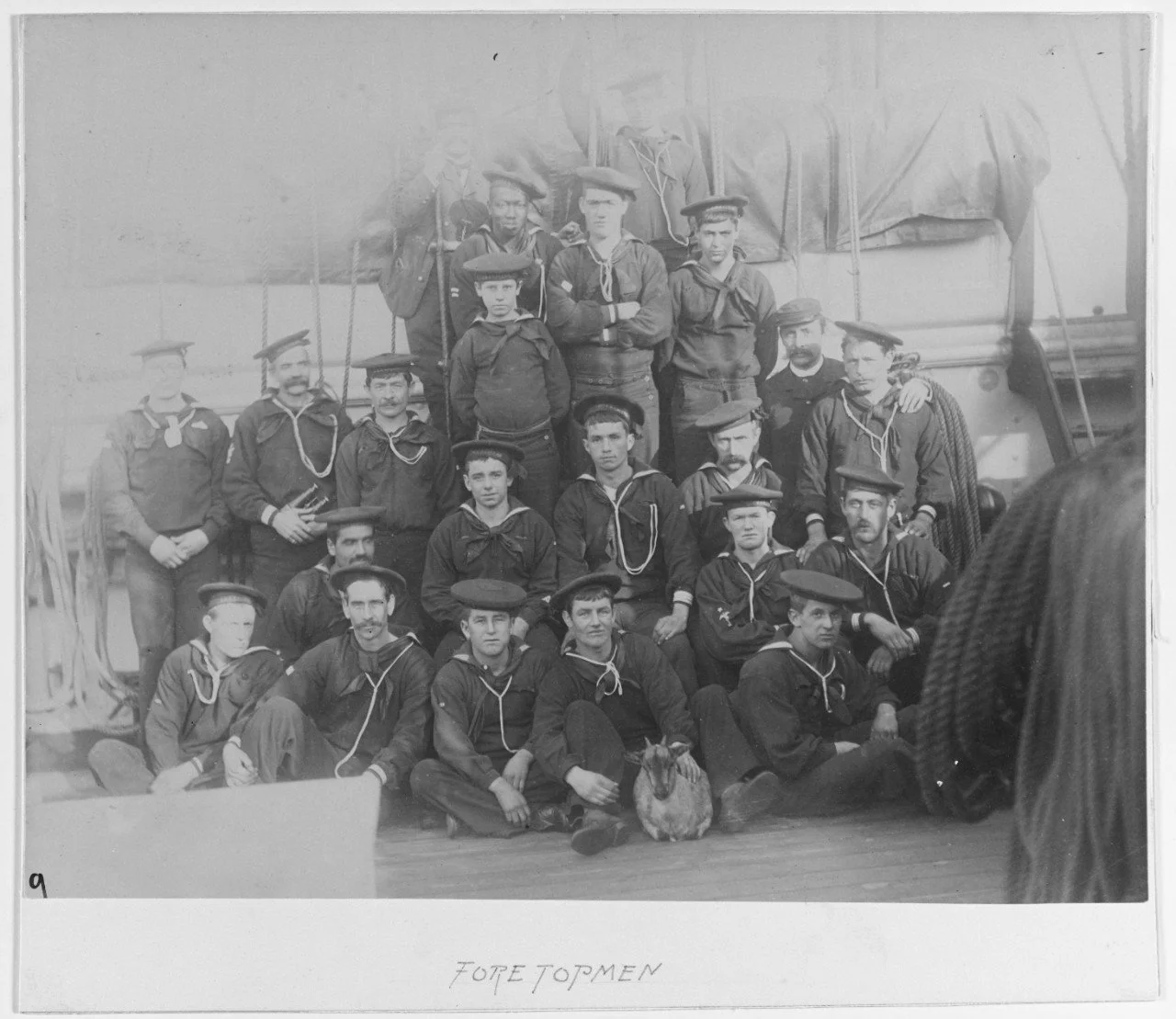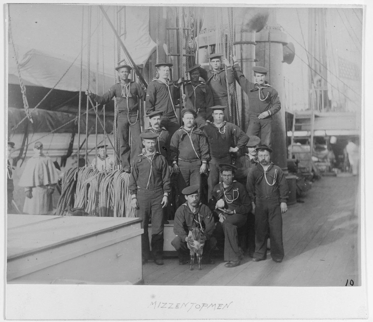 Foretopmen of USS Galena in the 1880s - with goat. Naval History and Heritage Command Photo