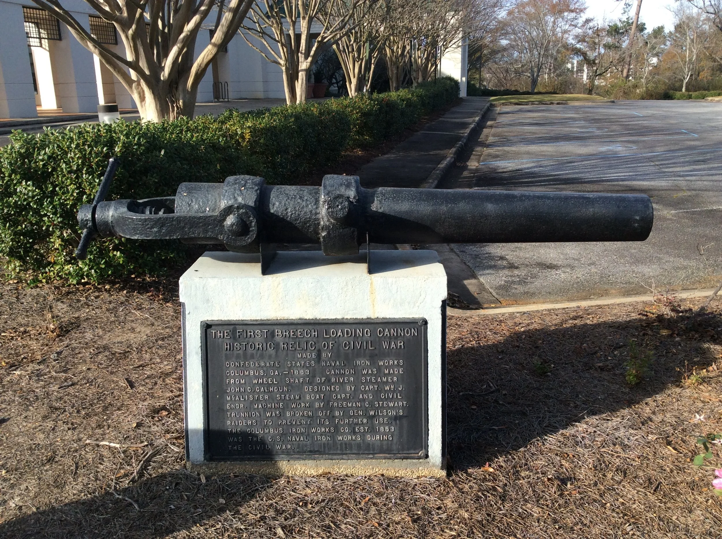 The Columbus Breechloader as previously displayed outside the Columbus Museum. Photographed by J. Makali Bruton, December 25, 2017. Posted on the Historical Marker Database.