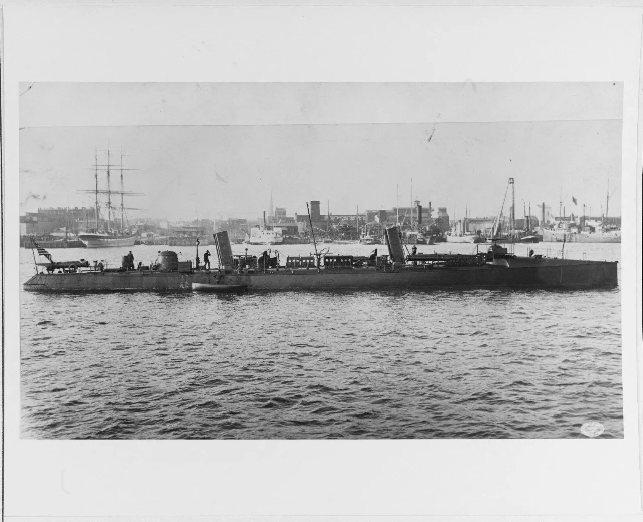 4. The entrance was begun at 12:30, high tide, the Hudson on the starboard side and the Winslow on the portside of the Wilmington assisting in marking out shoal water. No vessels were in sight on entering Cardenas Bay save two square-rigged merchantmen with sails unbent, anchored directly off the town. As it was thought possible that gun boats might attempt to escape, the Hudson was sent along the western side and the Winslow along the eastern side of the bay to intercept them in event of such movement: not finding them the three vessels met off the town at a distance of about 3500 yards. When in this position the Winslow was signaled to approach the Wilmington within hail and I was directed by Captain Todd to go in and investigate a small gun boat then observed for the first time: --painted grey, with black smoke stack, apparently not under steam and moored to a wharf, to the left of which arouse a compact mass of buildings close to the water front. Torpedoes were set for surface runs, the fans upon the war-noses were run up, so as to provide for explosion at short range for use alongside of the gun boat, and all preparations were made for immediate action.