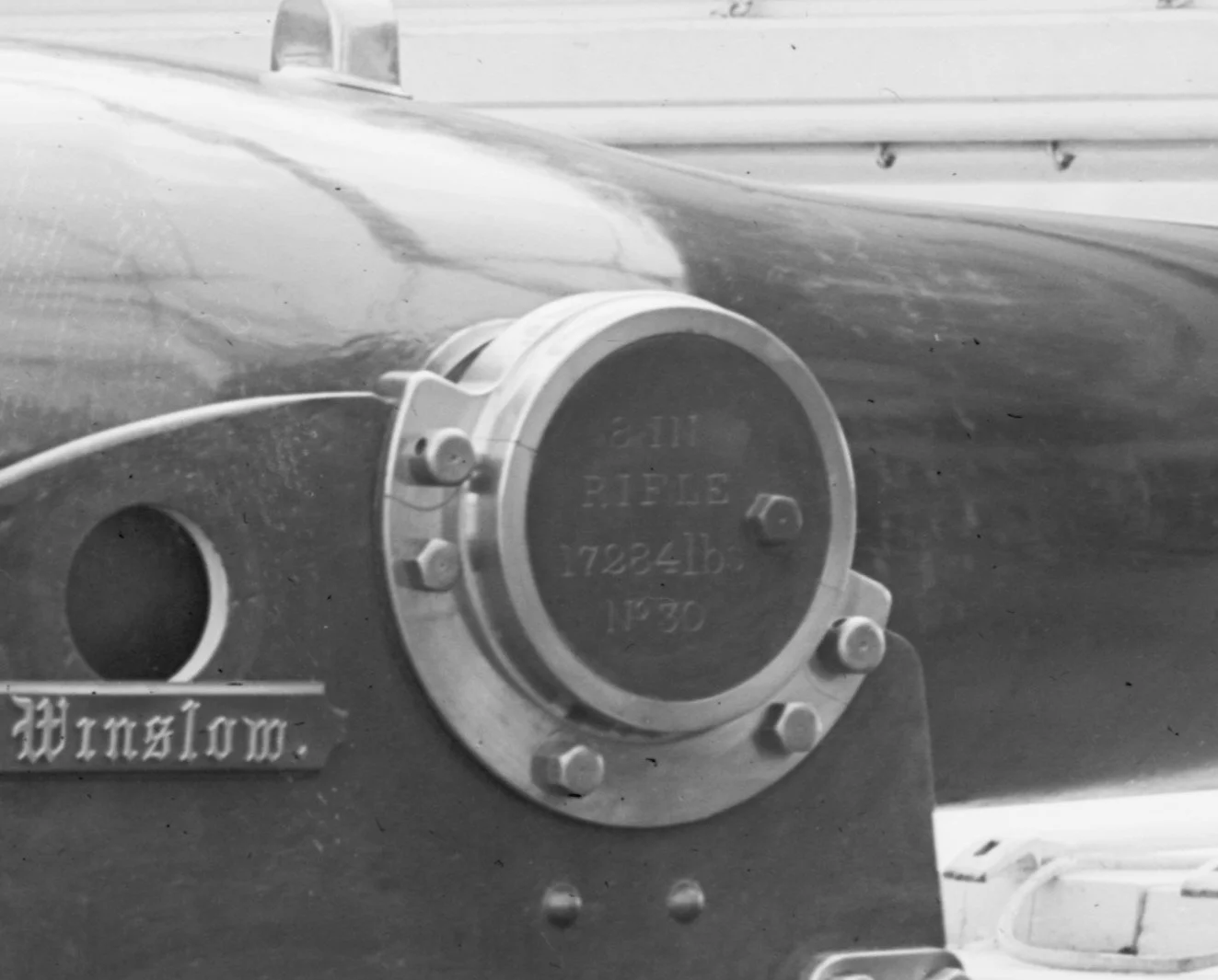 Right trunnion of 8-Inch Rifle Number 30 aboard USS Kearsarge circa 1890. Detail of above photo.