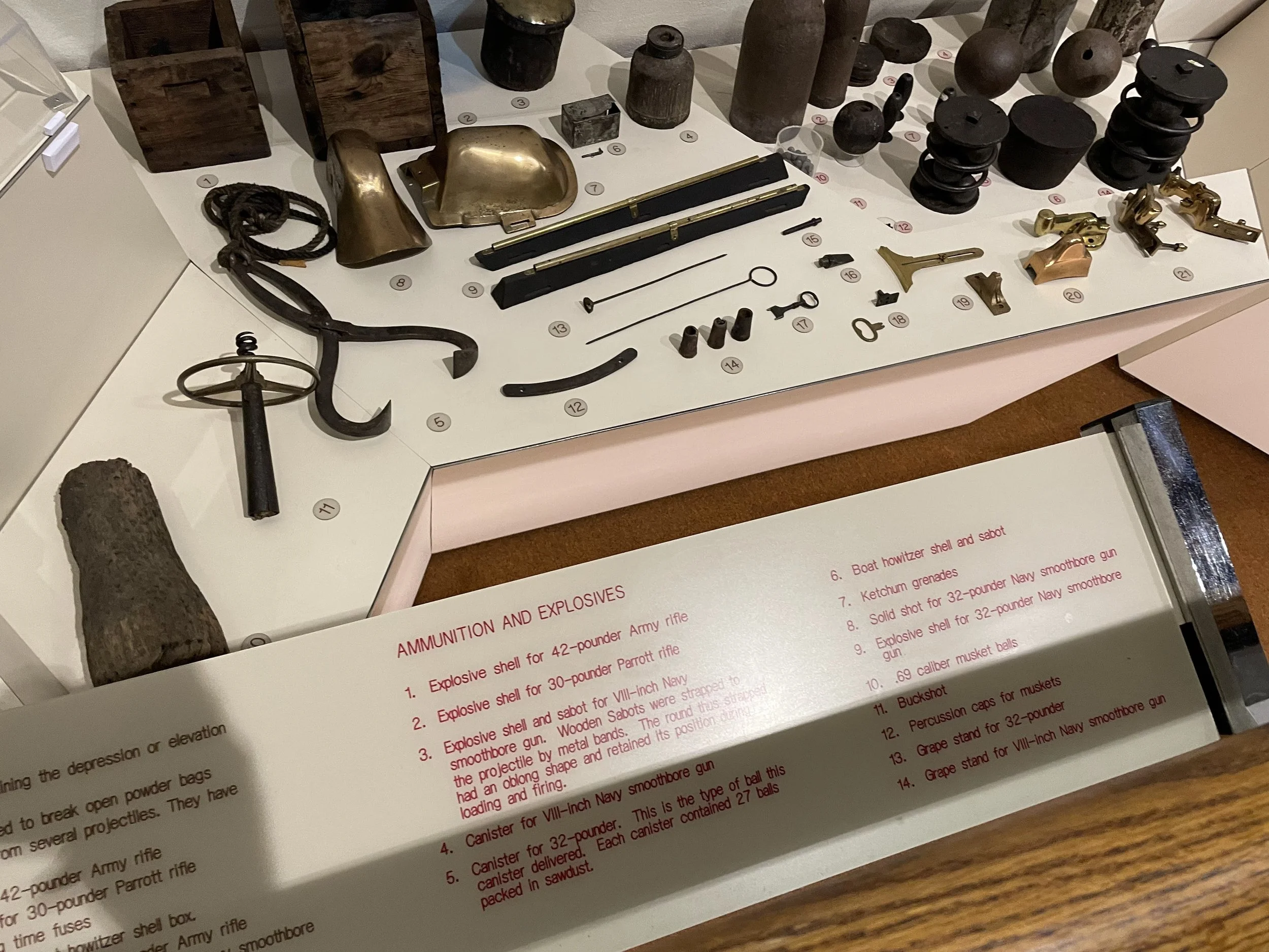 All three 42-Pounders were originally smoothbores but had been rifled for service in the American Civil War. Originally firing a 7-Inch, 42-pound round shot, as rifles they were capable of firing much heavier projectiles. Upon recovery, two of the 42-Pounders were found to be loaded with 87 pound explosive shells. A similar shell may be seen among the display of projectiles in adjacent museum.