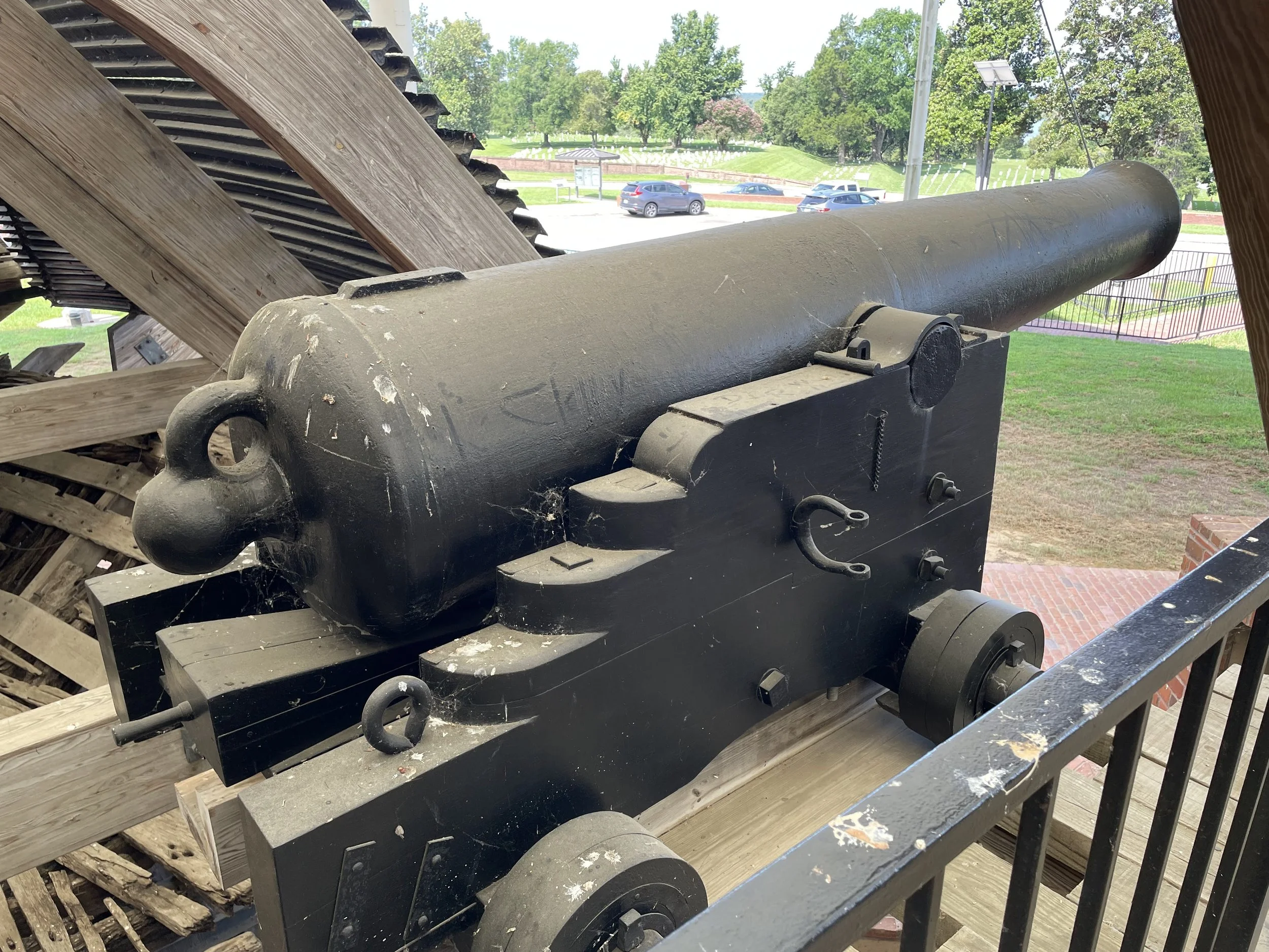 The bow guns of USS Cairo as seen from the interior. The guns are from left to right: 42-Pounder Number 28, 8-Inch Number 368, and 42-Pounder Number 20.