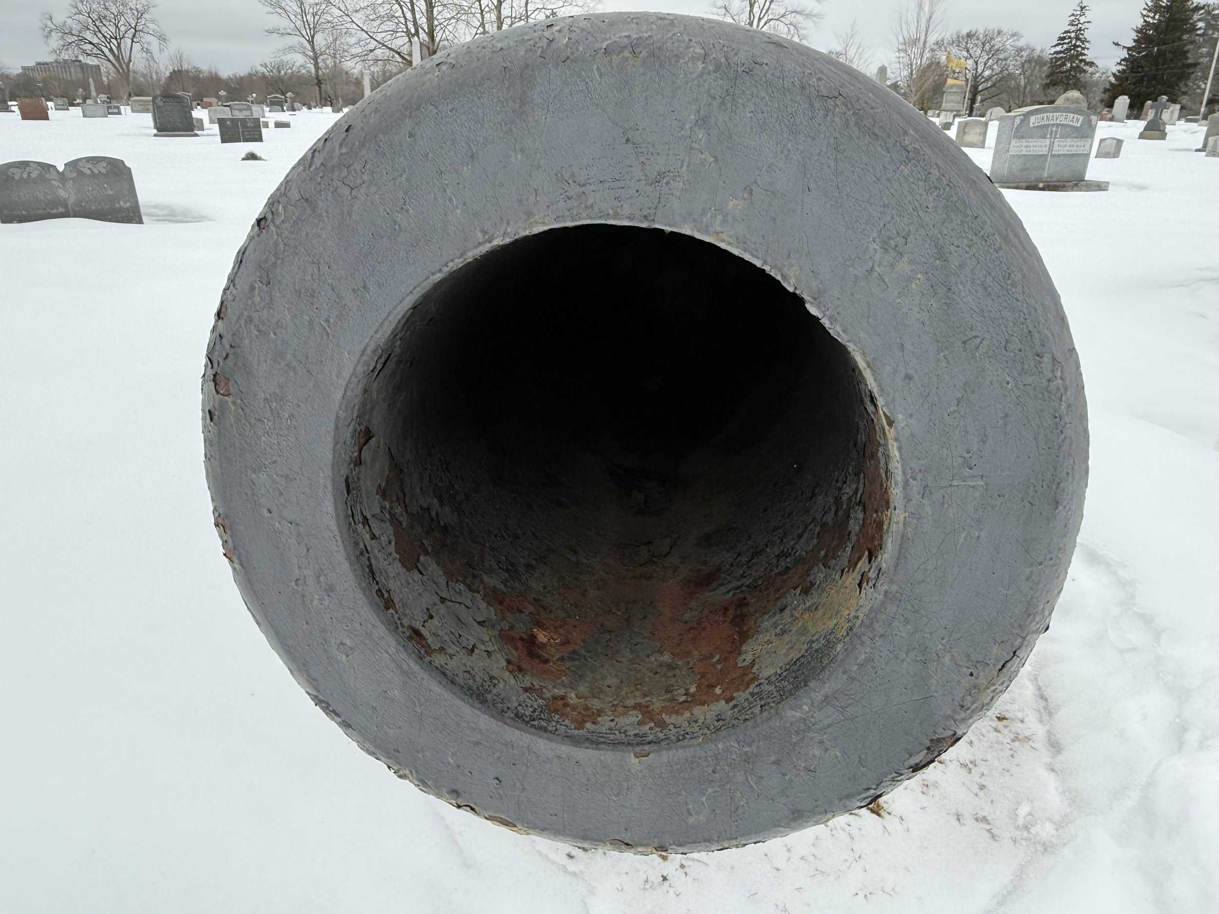 In service, the 10-Inch Rodman would have been mounted on a wrought iron carriage. The oval-shaped sockets in the rear of the cannon were to allow levers to change the elevation of the gun. This cannon is a smoothbore designed to fire projectiles which were 10-inches in diameter. In service, this cannon could fire either an approximately 128-pound round shot or an approximately 100-pound explosive shell.