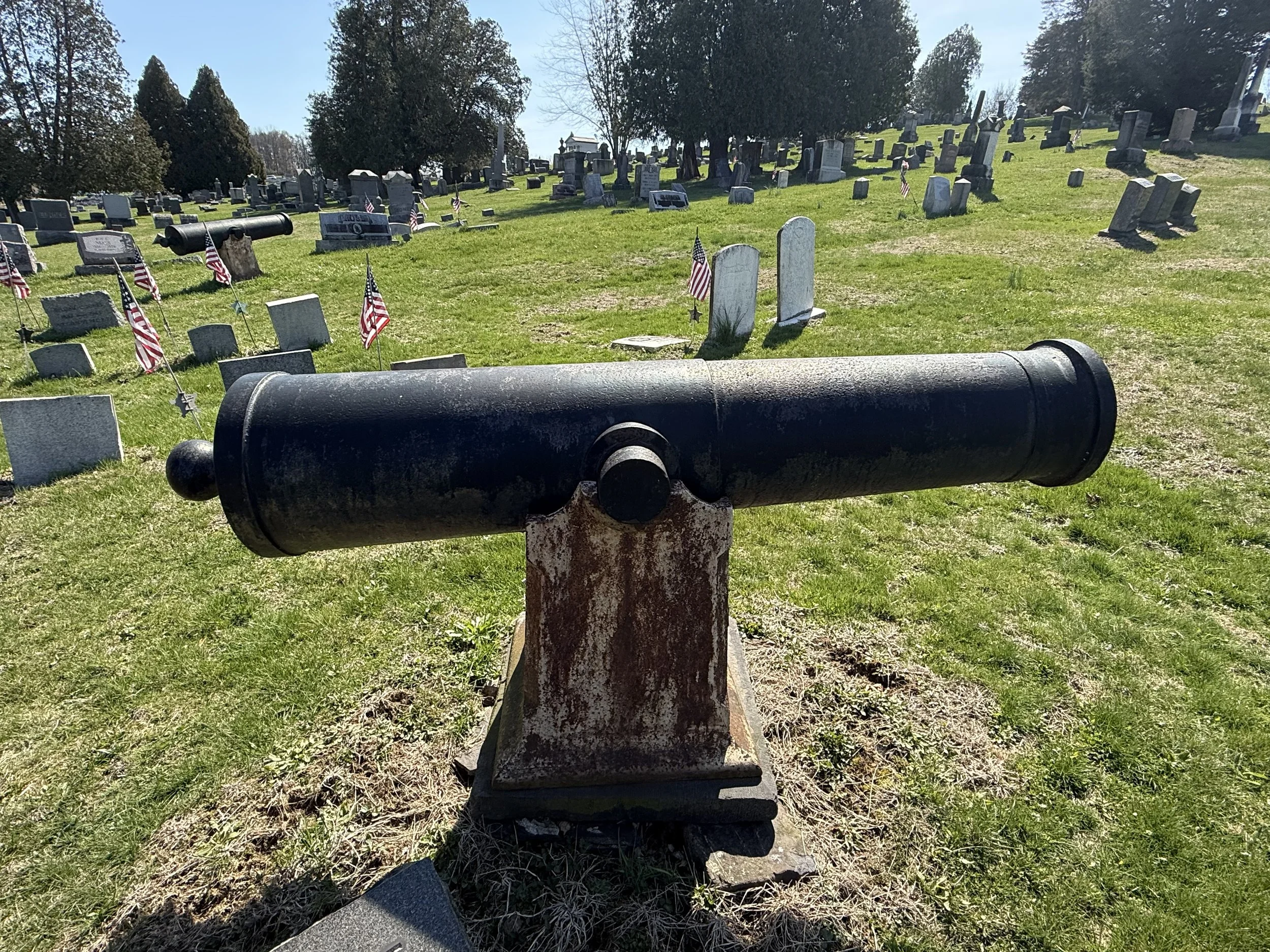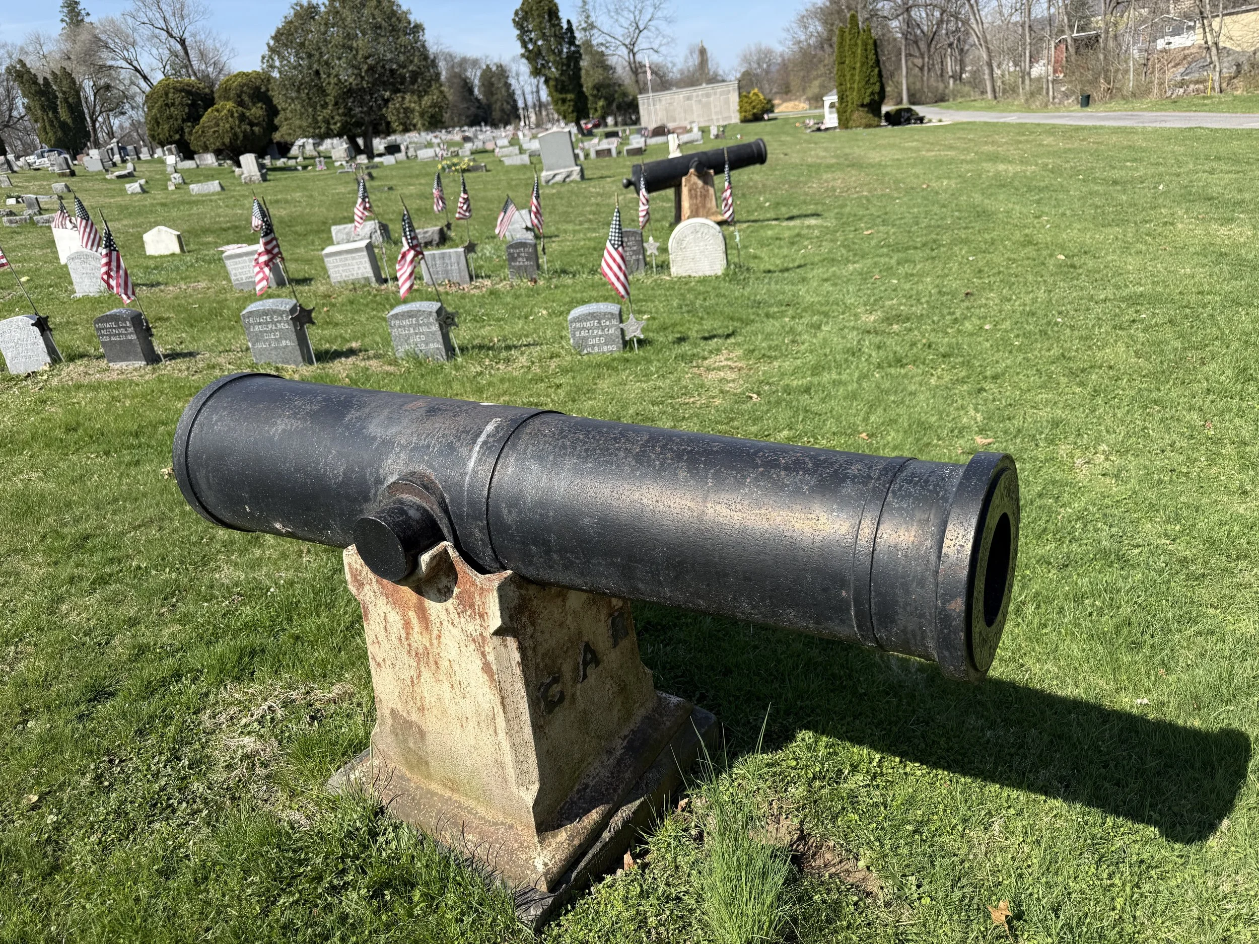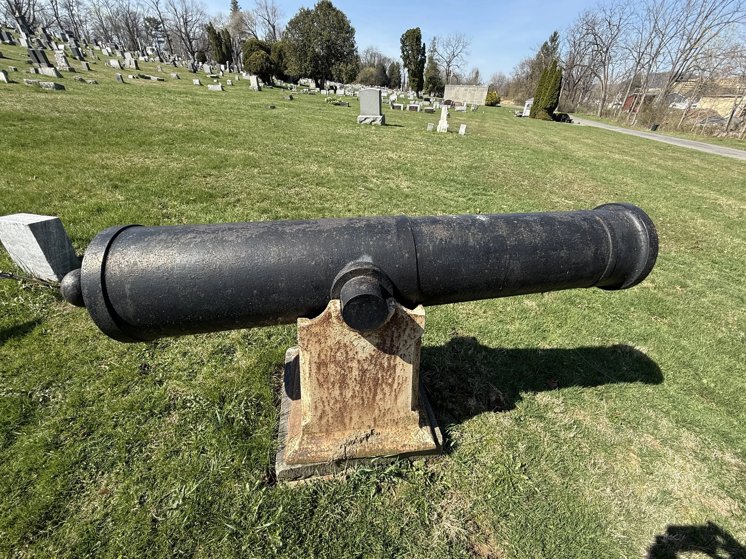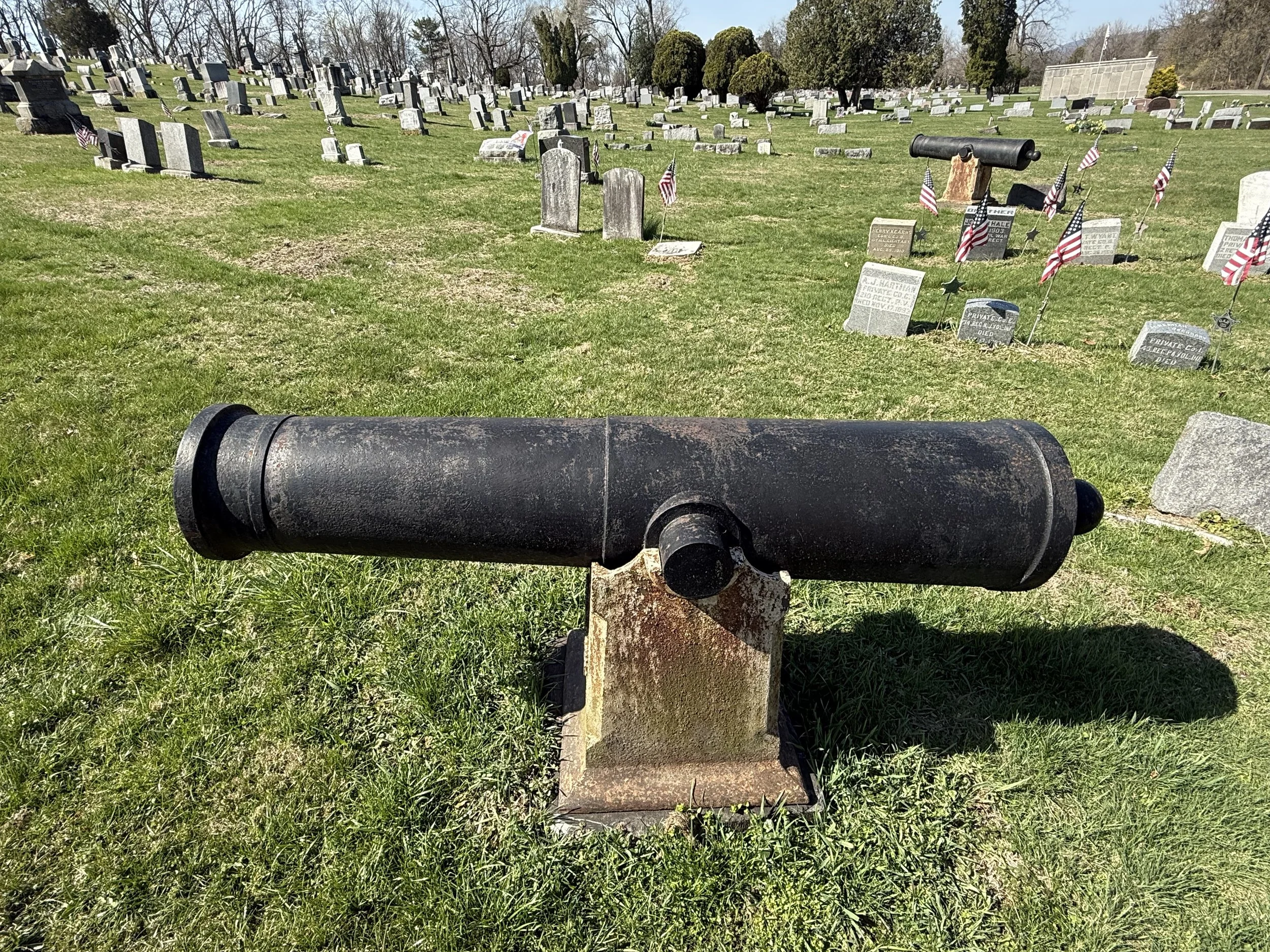 Four US Army 24-Pounder Flank Howitzers are displayed around a section of Veterans' graves at the Oddfellows Cemetery in Danville, Pennsylvania. Many thanks to friend-of-the-page James Murray for these photos!