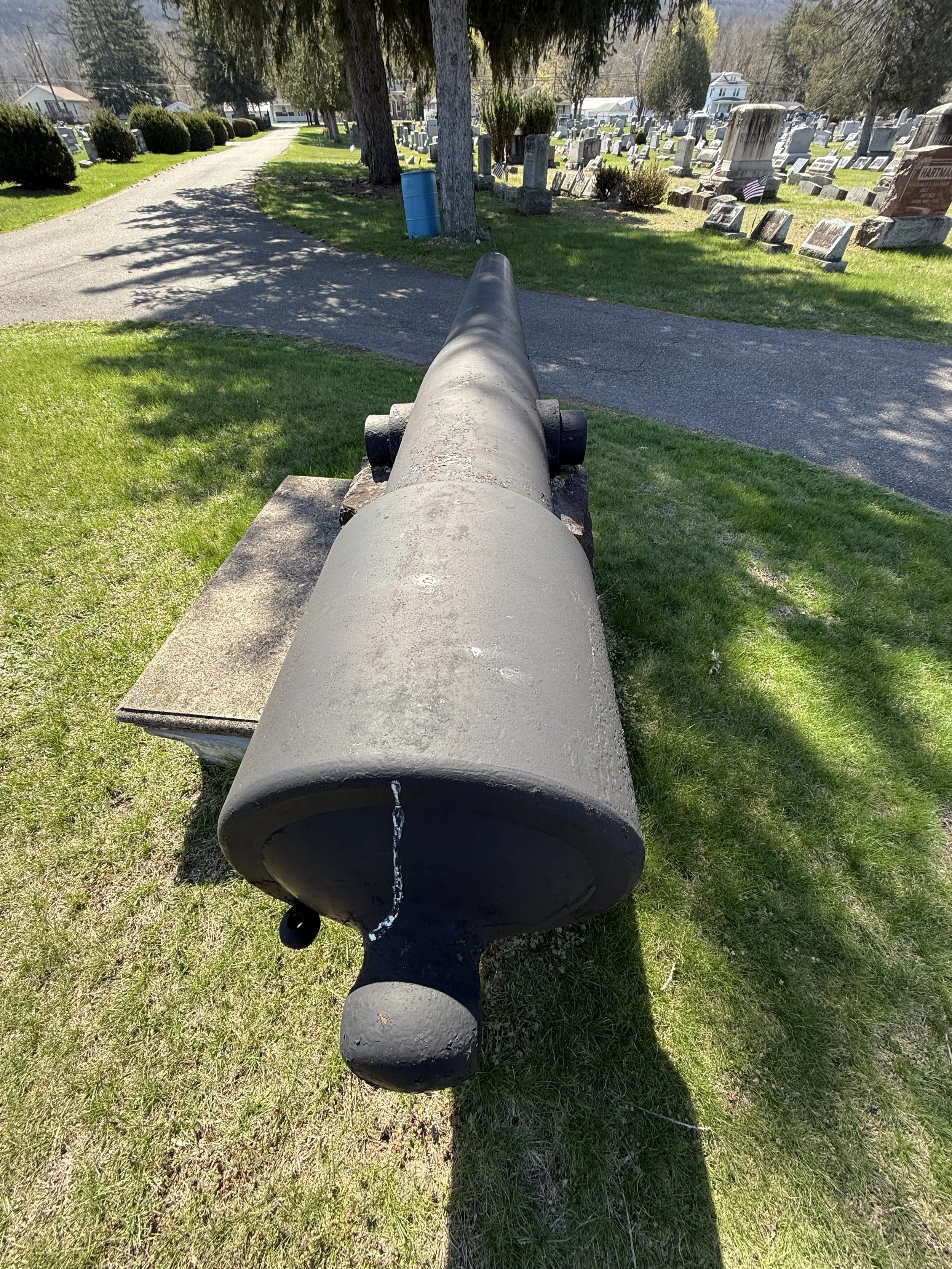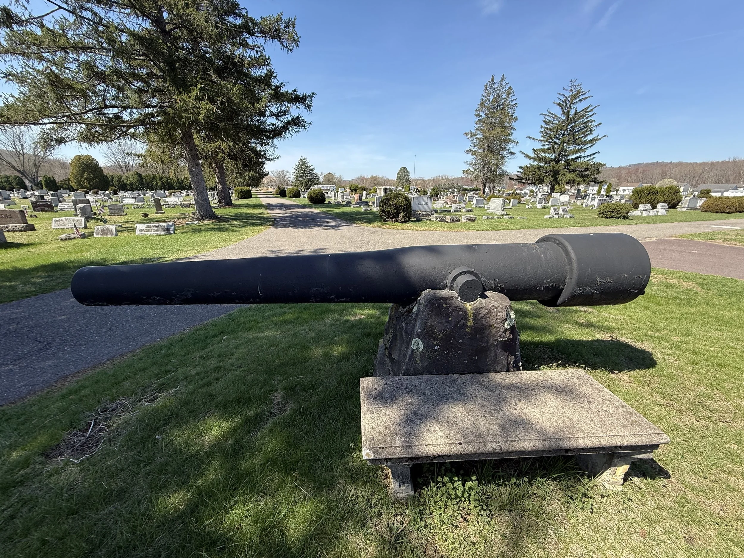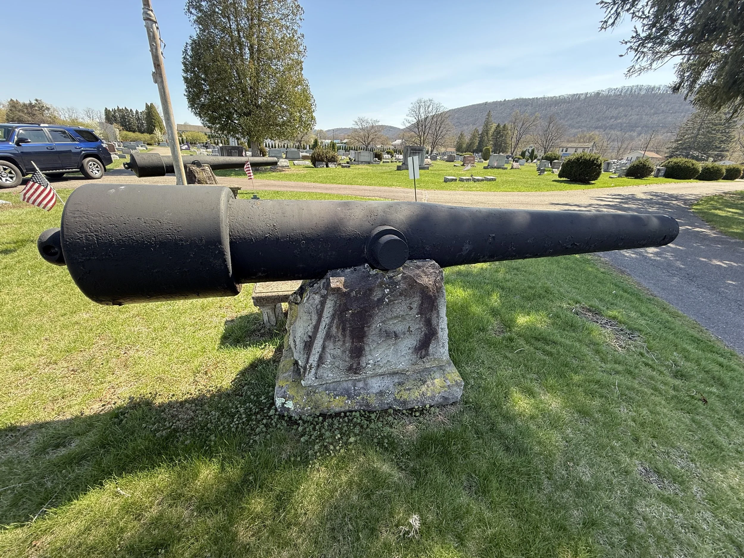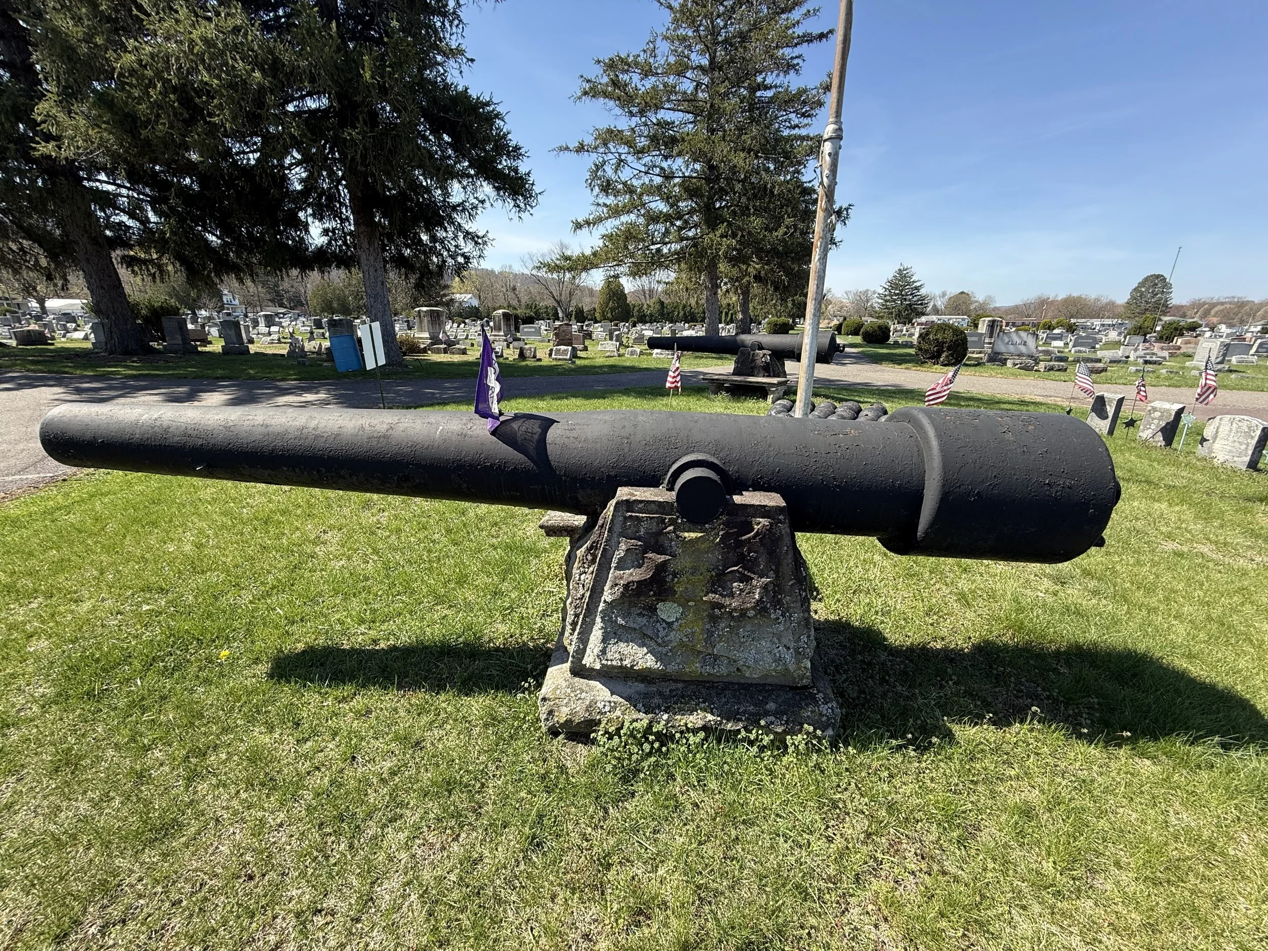 Two US Army 30-Pounder Parrott Rifles flank a flagpole in New Rosemont Cemetery in Bloomsburg, Pennsylvania. They are displayed upside down on their stone pedestals. Many thanks to friend-of the page James Murray for taking the photos of the Parrotts in Bloomsburg.