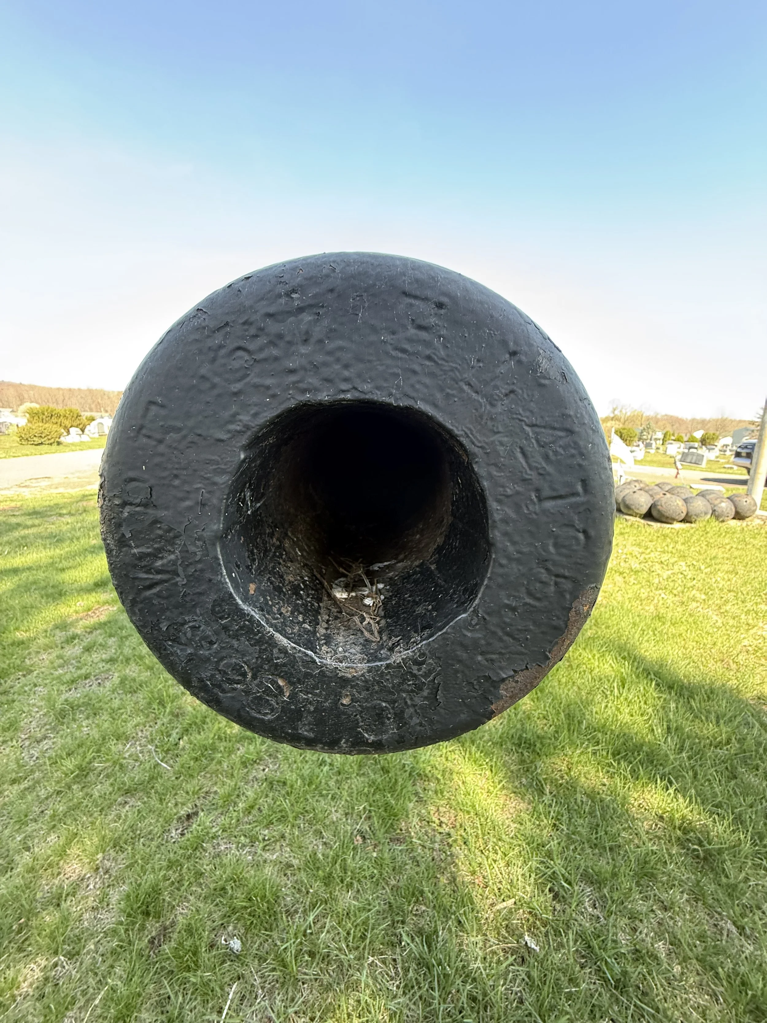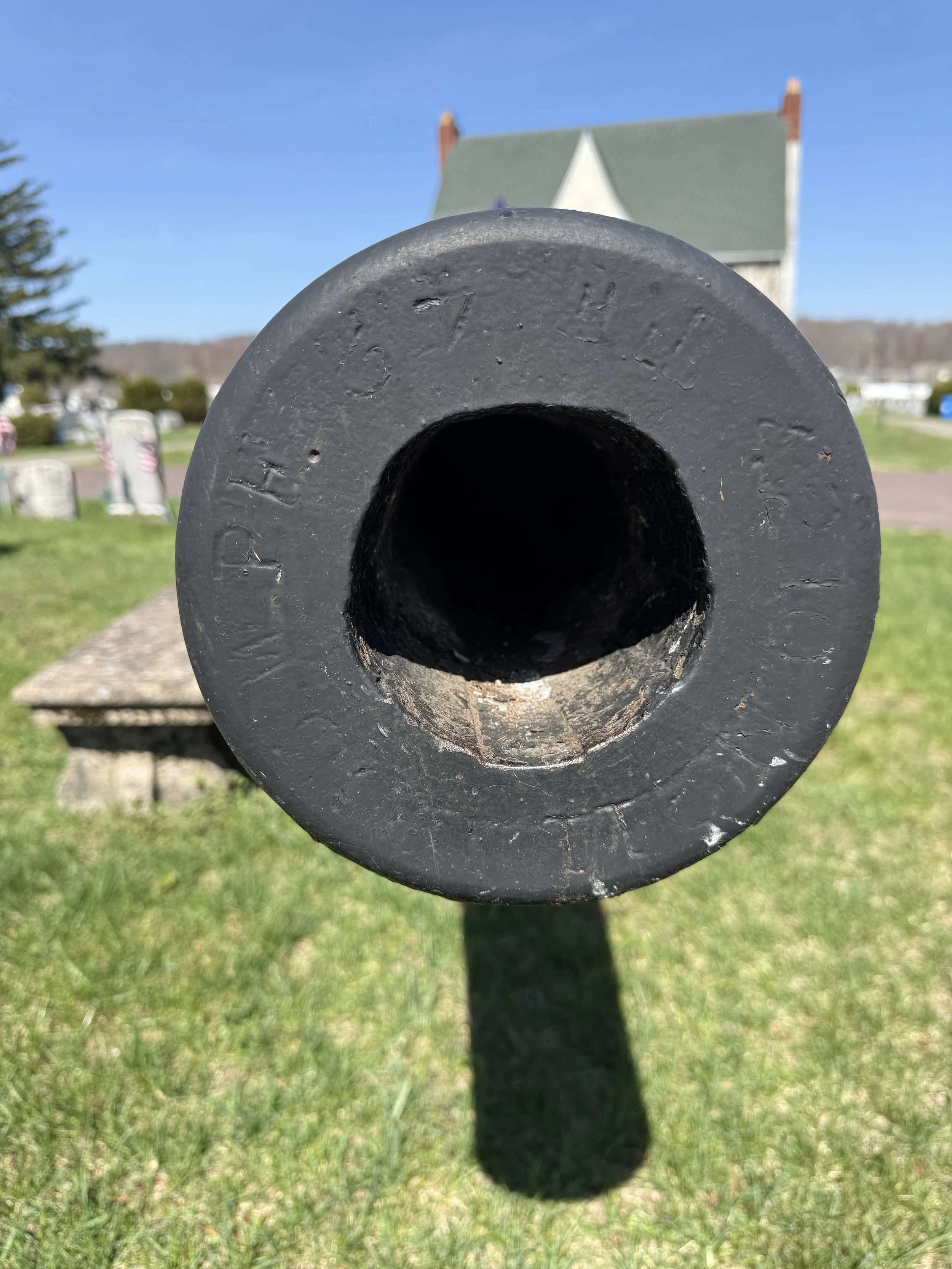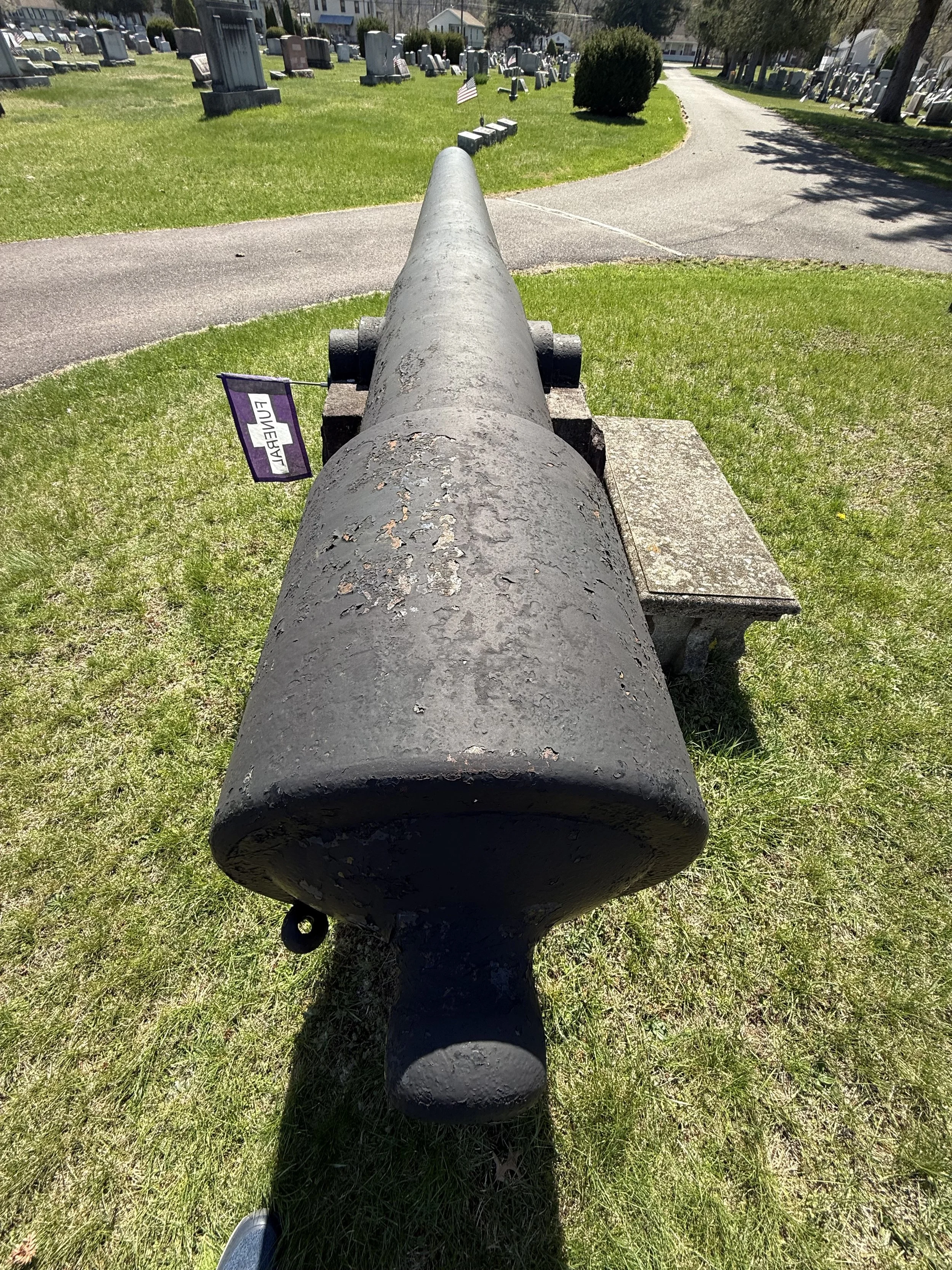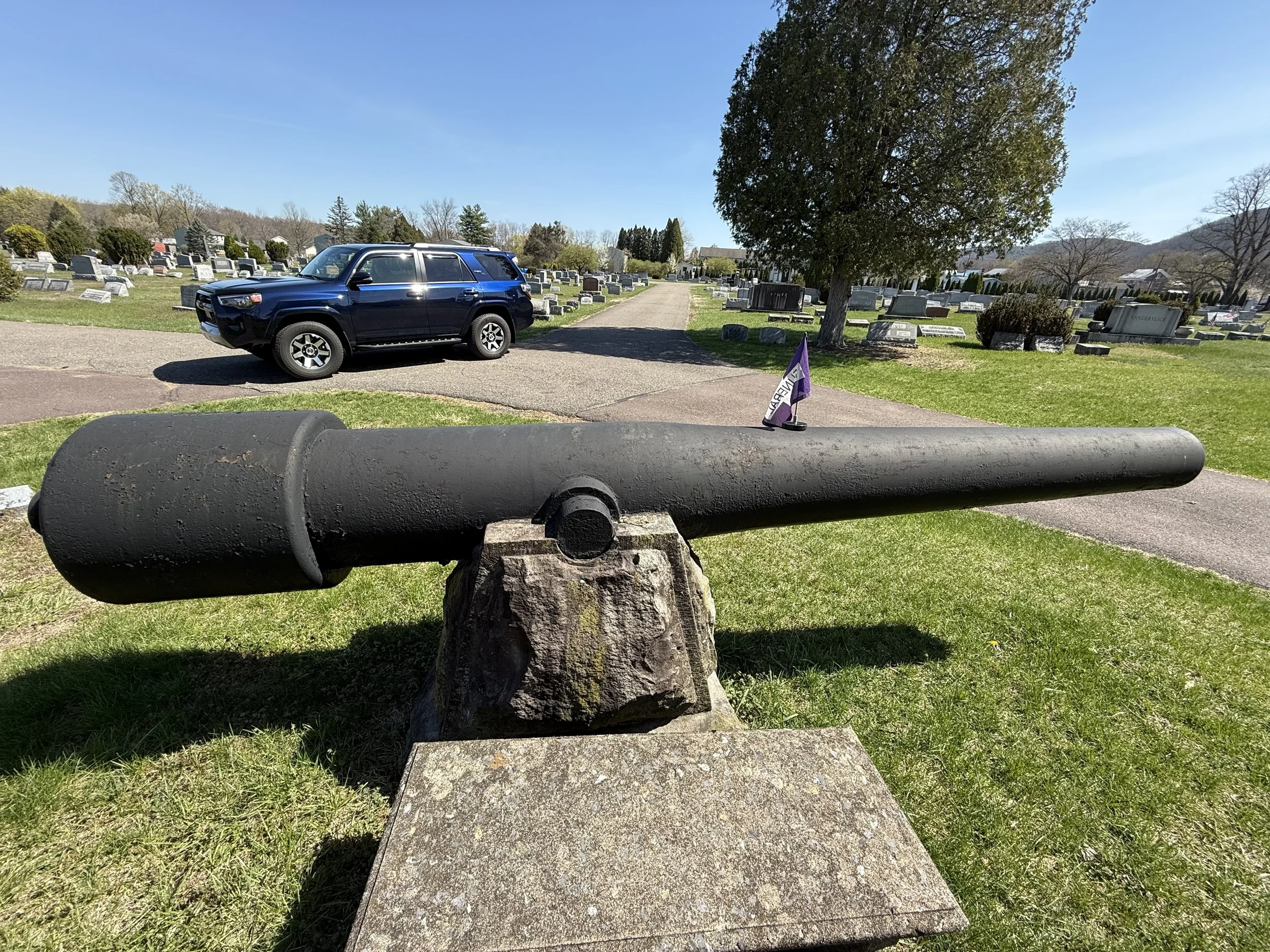Two US Army 30-Pounder Parrott Rifles flank a flagpole in New Rosemont Cemetery in Bloomsburg, Pennsylvania. They are displayed upside down on their stone pedestals. Many thanks to friend-of the page James Murray for taking the photos of the Parrotts in Bloomsburg.