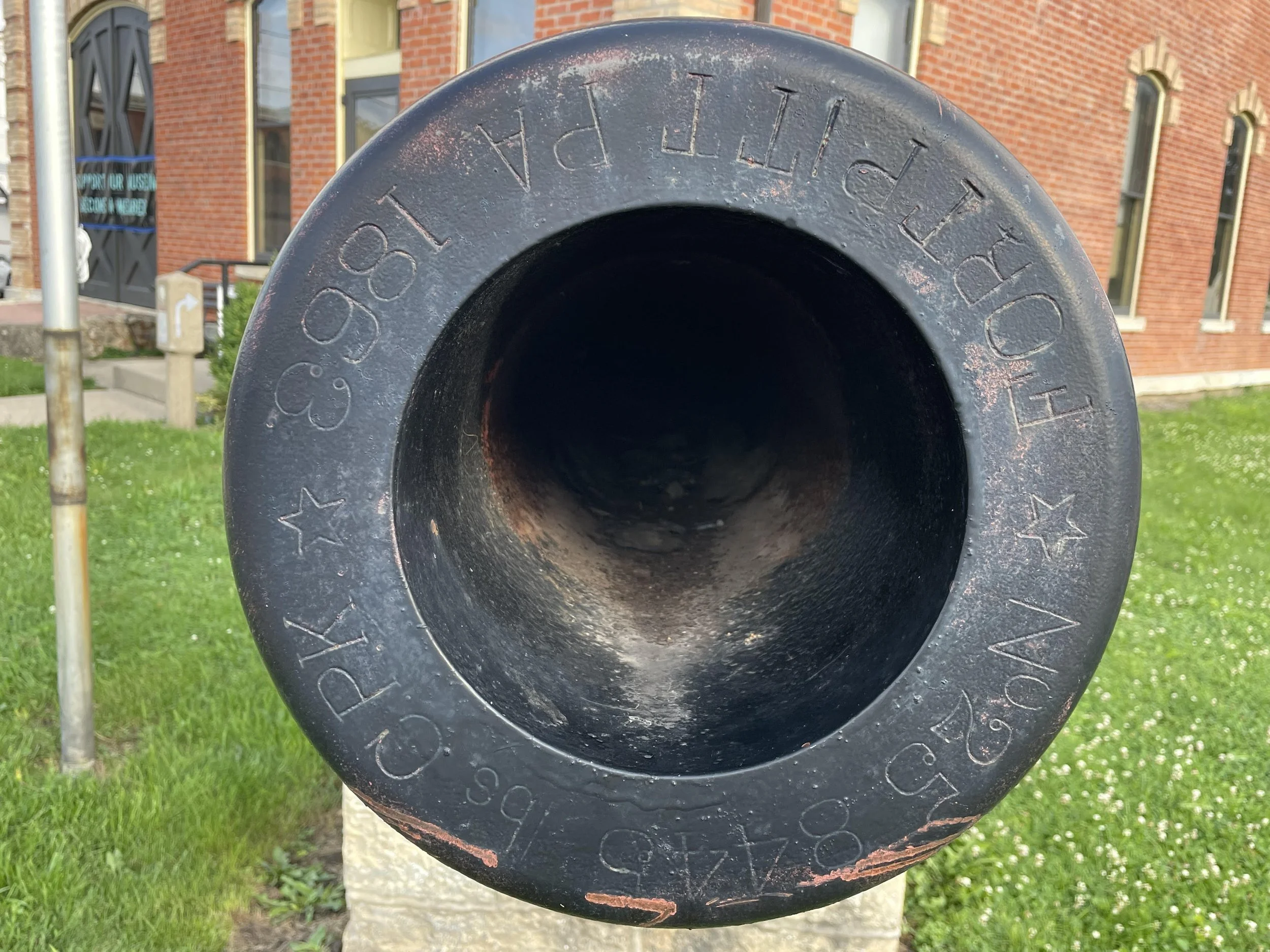 8-Inch Rodman Number 25 was presented to the people of Flagg Township by Grand Army of the Republic Post 546 at a ceremony held on October 10th, 1899. The cannon had been shipped from Fortress Monroe to Rochelle in 1898. According to a research paper held by the museum, the cannon was originally displayed alongside twenty 10-inch cannon balls stacked in a pyramid. During the Second World War, the cannon balls were donated to a scrap drive but the 8-Inch Rodman was retained.