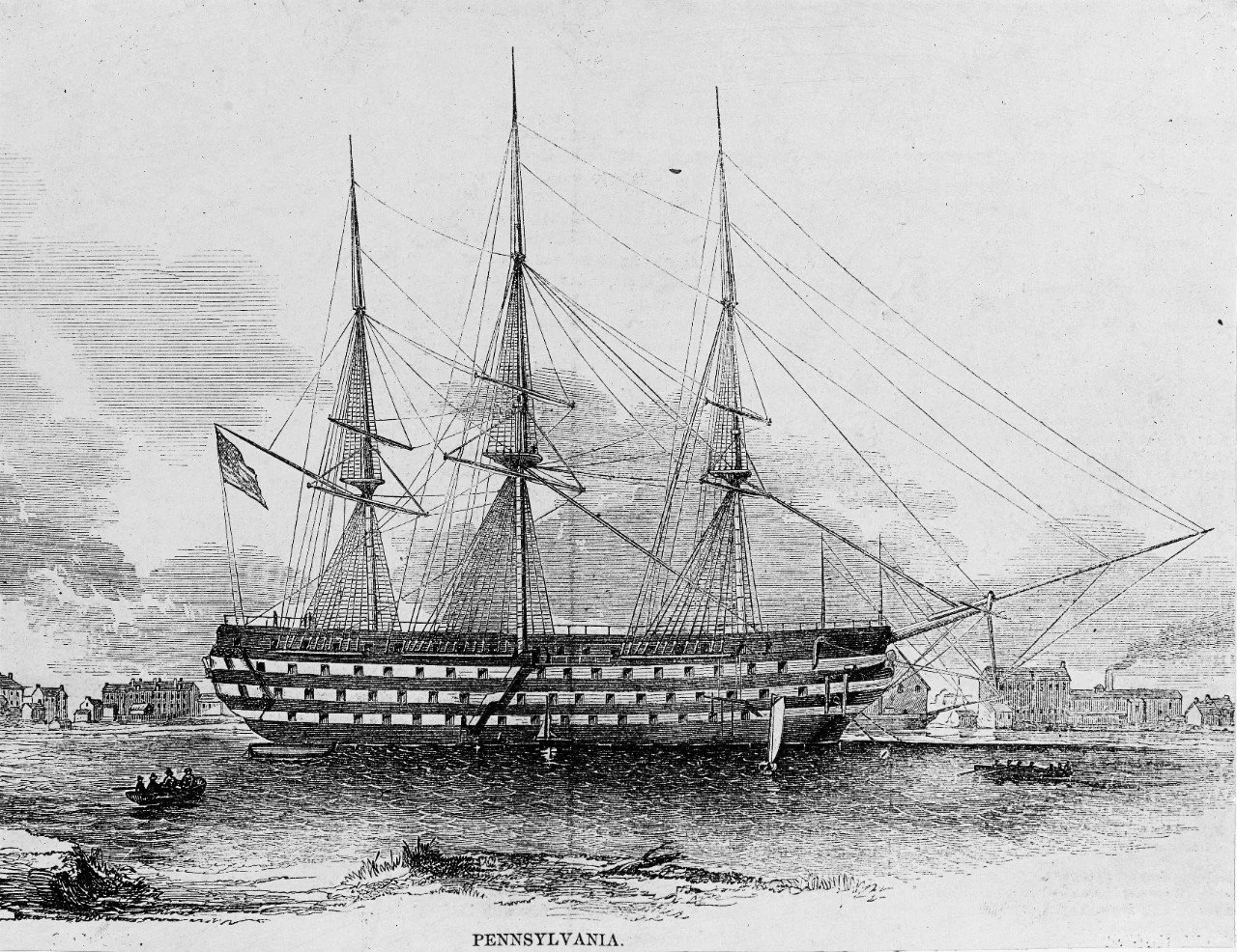 Line engraving of USS Pennsylvania published in Gleason's Pictorial, 9 July 1853, showing the ship at anchor off the Norfolk Navy Yard, Portsmouth, Virginia, where she was the receiving ship. Naval History and Heritage Command: https://www.history.navy.mil/content/history/nhhc/our-collections/photography/numerical-list-of-images/nhhc-series/nh-series/NH-42000/NH-42715.html