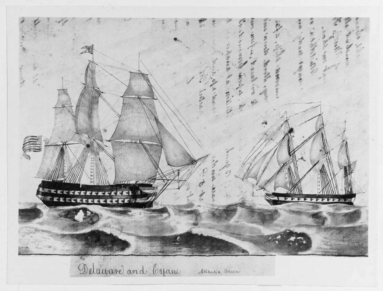 USS Cyane (right) with USS Delaware in a drawing also by Gunner William H. Meyers. Delaware’s sister ship was USS North Carolina. Naval History and Heritage Command: https://www.history.navy.mil/content/history/nhhc/our-collections/photography/numerical-list-of-images/nhhc-series/nh-series/NH-02000/NH-2022.html