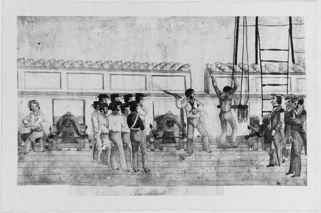 While the details of the gun and carriage are interesting for the purposes of tracing the possible history of Number 2, the subject matter - a sailor being flogged - slows that the Navy was still flogging sailors as it would do until the practice was outlawed by Congress in the 1850s. On whatever ship Number 2 served, it may well be a witness to this aspect of naval life, as well as many others. See Naval History and Heritage Command’s article on flogging.