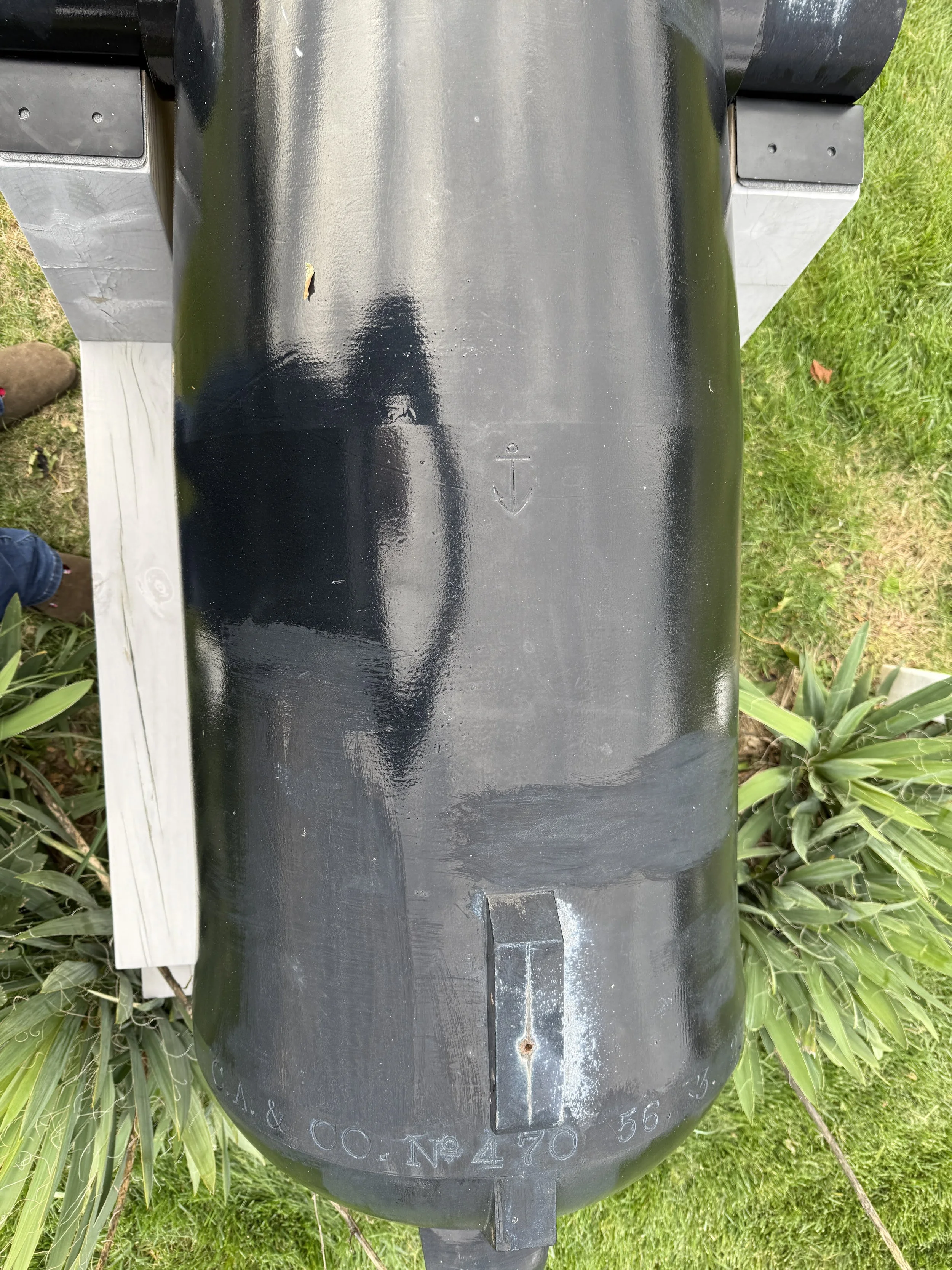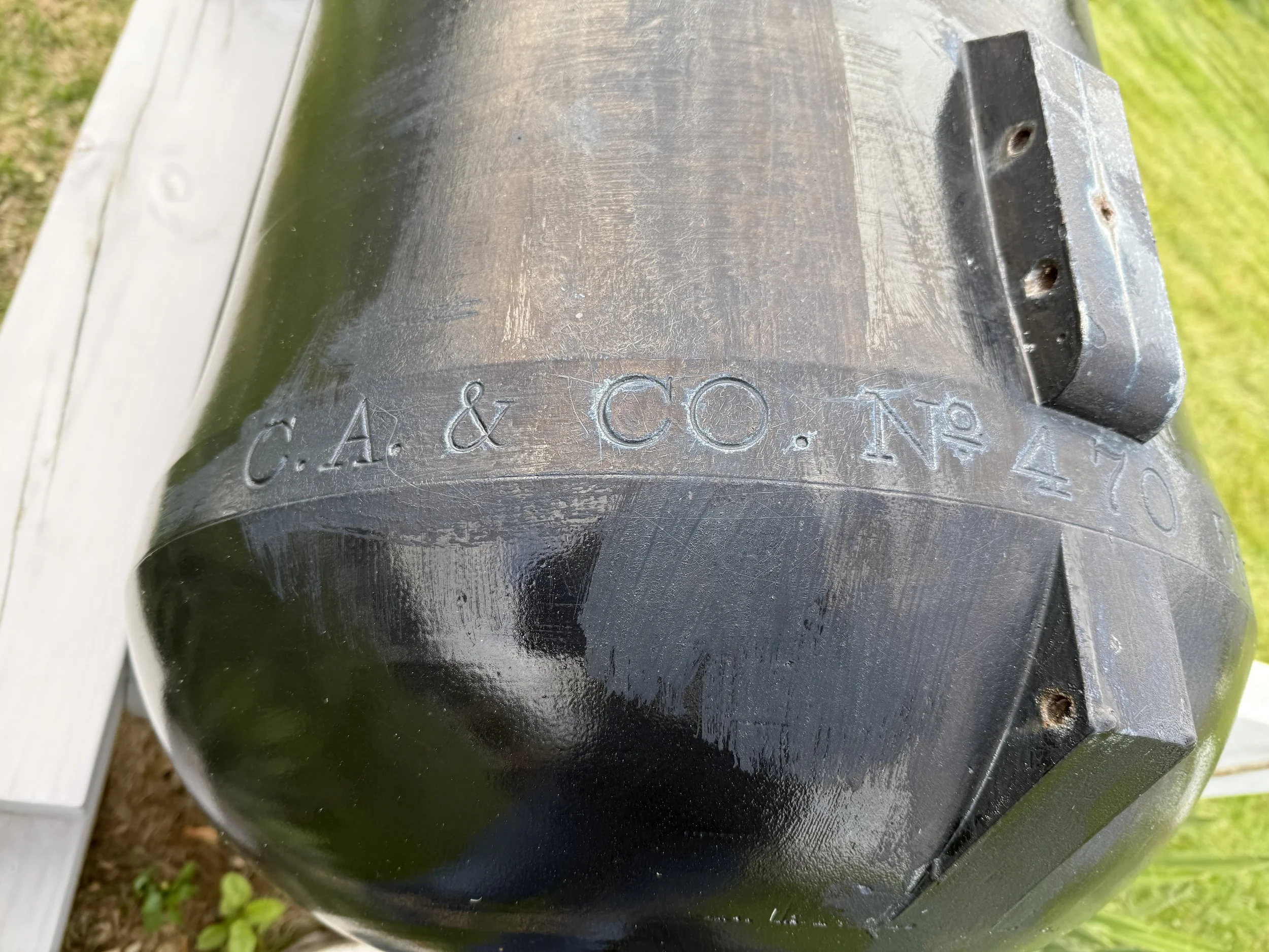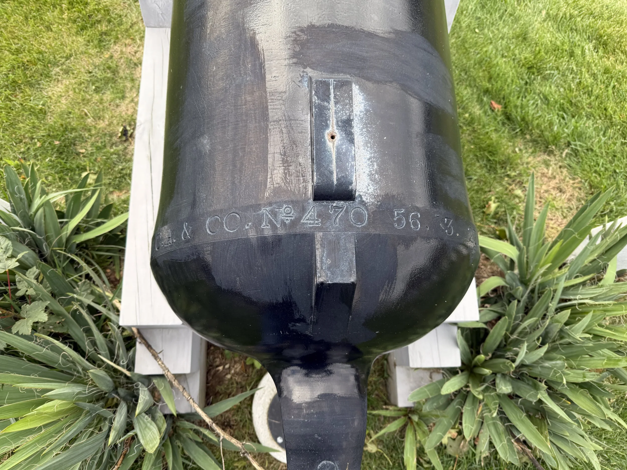 32-Pounder 57cwt Number 470 cast by Cyrus Alger & Co. in 1848. As manufactured it weighed 56-3-23 in hundredweight (6,463 pounds).