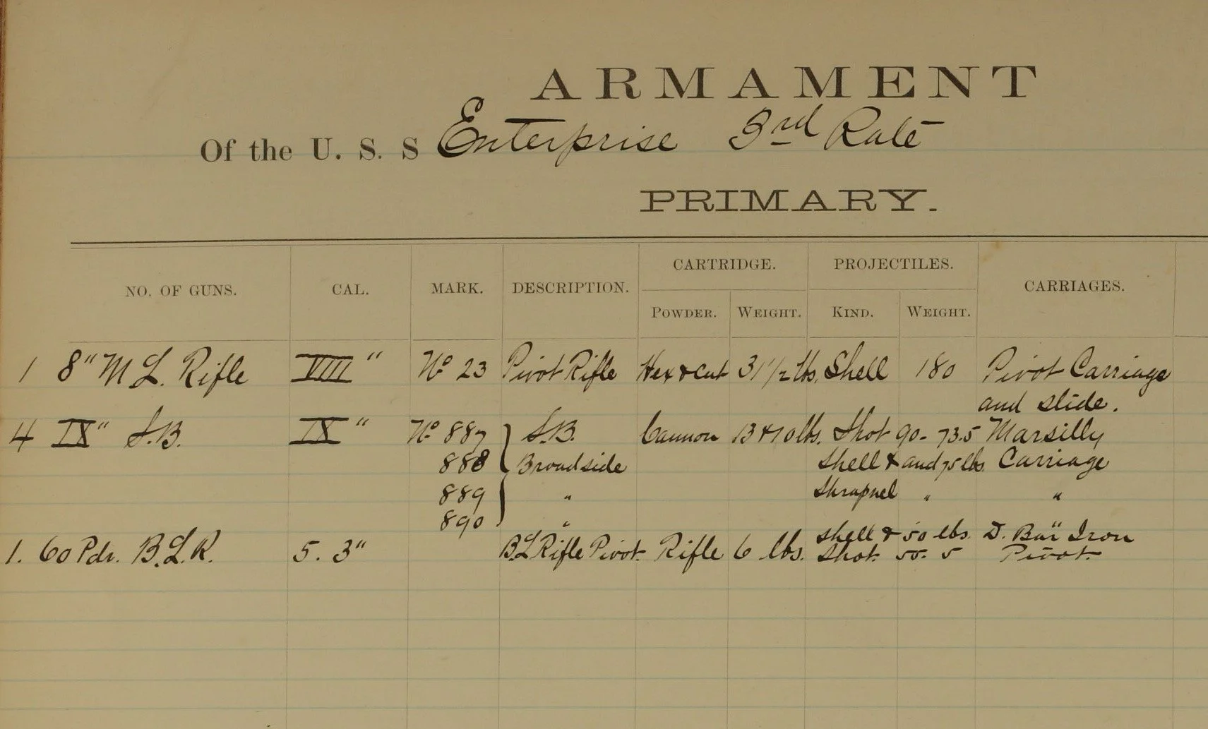 Armament page of the 1889 logbook of USS Enterprise showing Number 887 aboard.