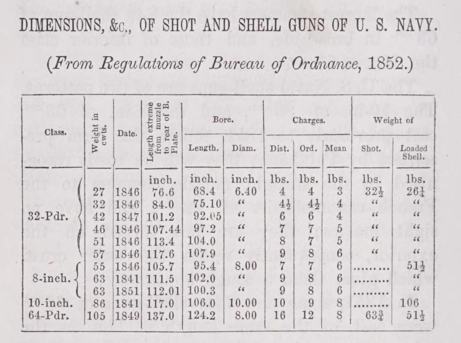 Table from John Dahlgren's book "Shells and Shell Guns", pg. 26.