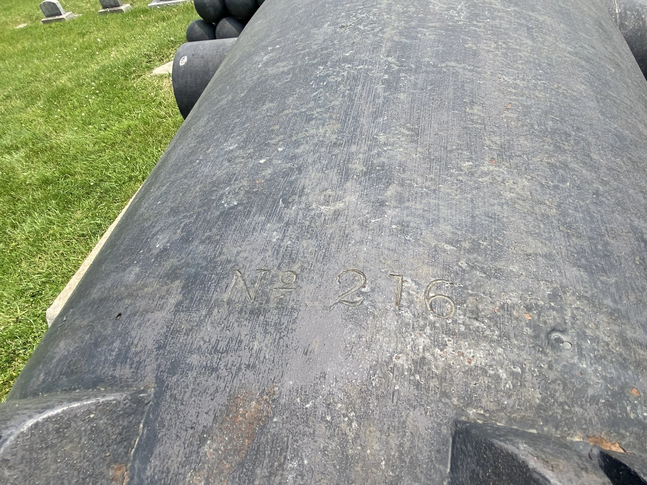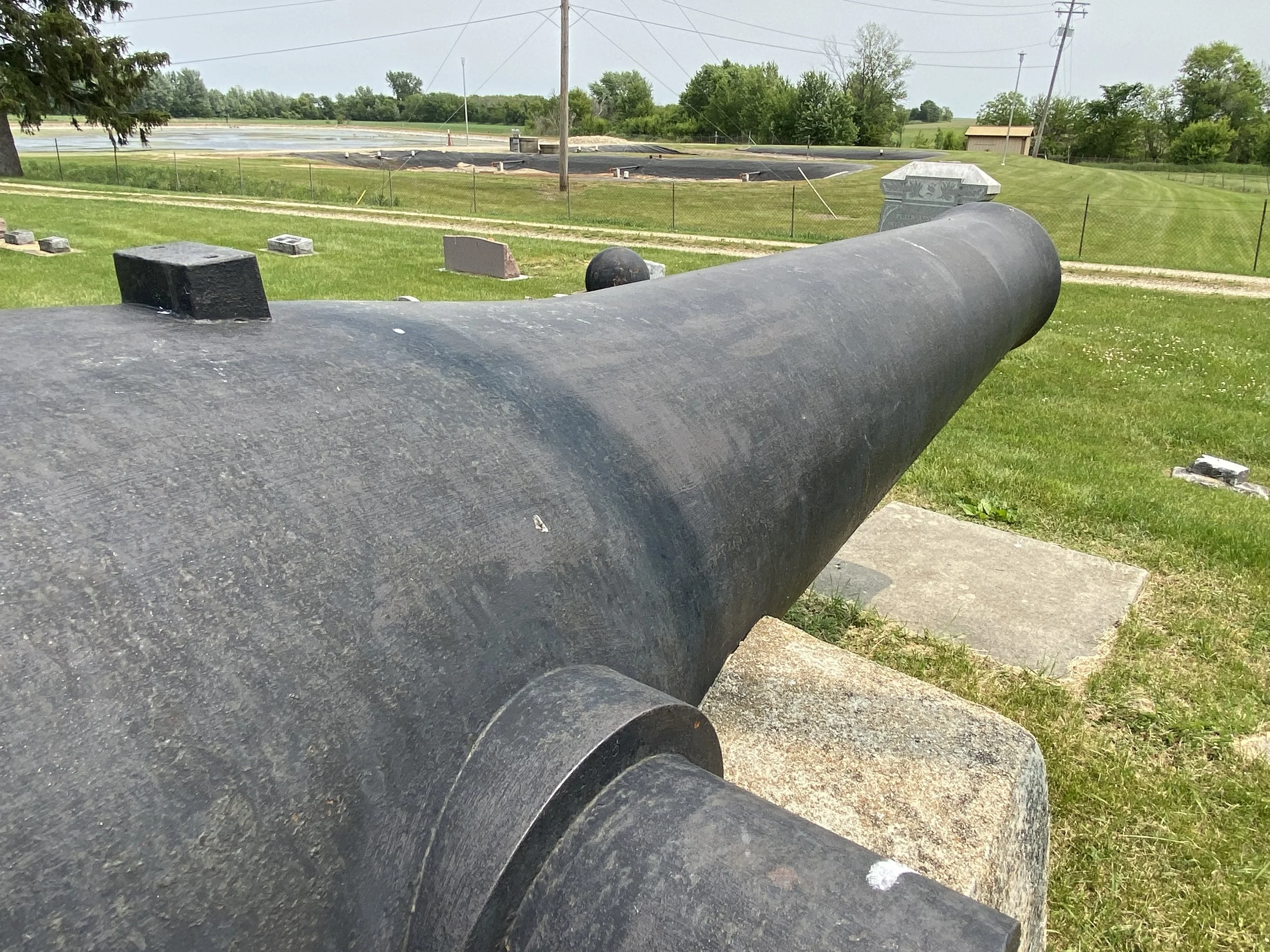 The cannon at Greenfield Cemetery in La Moille is a United States Navy 11-Inch Shell Gun of 16,000 Pounds. La Moille’s 11-Inch Dahlgren is US Navy Registry Number 216. It was manufactured by Cyrus Alger & Company in 1862. As manufactured it weighed 15,765 pounds. It was proofed and inspected by US Navy officer William R. Taylor. (All of the information in this paragraph can be seen in the markings on the cannon.)
