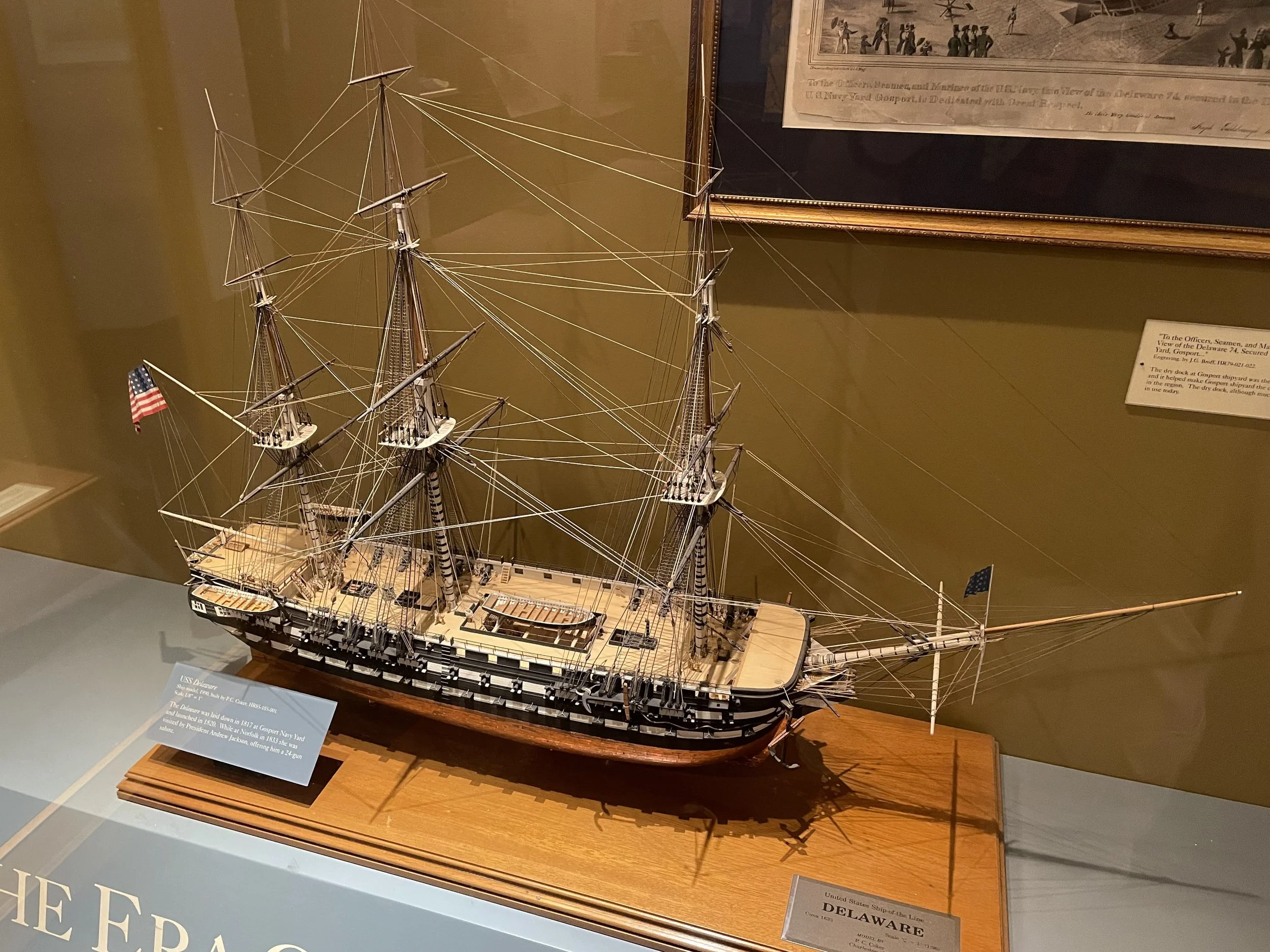 Model of USS Delaware, sister ship of USS New Hampshire, displayed at the Hampton Roads Naval Museum. The photos of the sailors with the Parrot Rifle would have been taken on the spar deck near the mizzen mast (a portion of the deck that may have also been called the quarterdeck). Model by P.C. Coker.