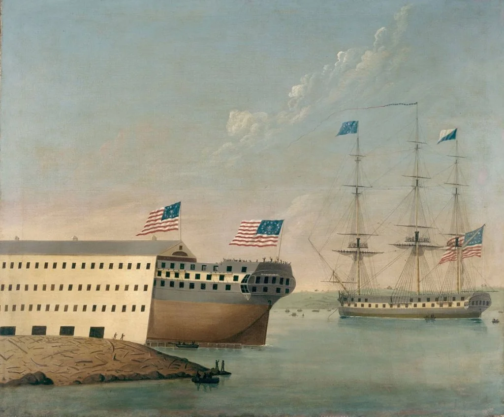 This painting of the launch of the ship of the line USS Washington at Portsmouth Naval Shipyard in Kittery, Maine shows what the launch of USS New Hampshire likely looked like. USS Alabama / New Hampshire had been kept on the stocks for decades in case she was needed. Painting attributed to John Samuel Blunt (1798–1835). Via Wikimedia.